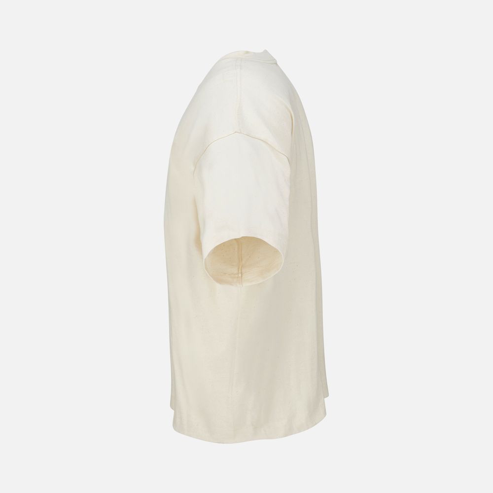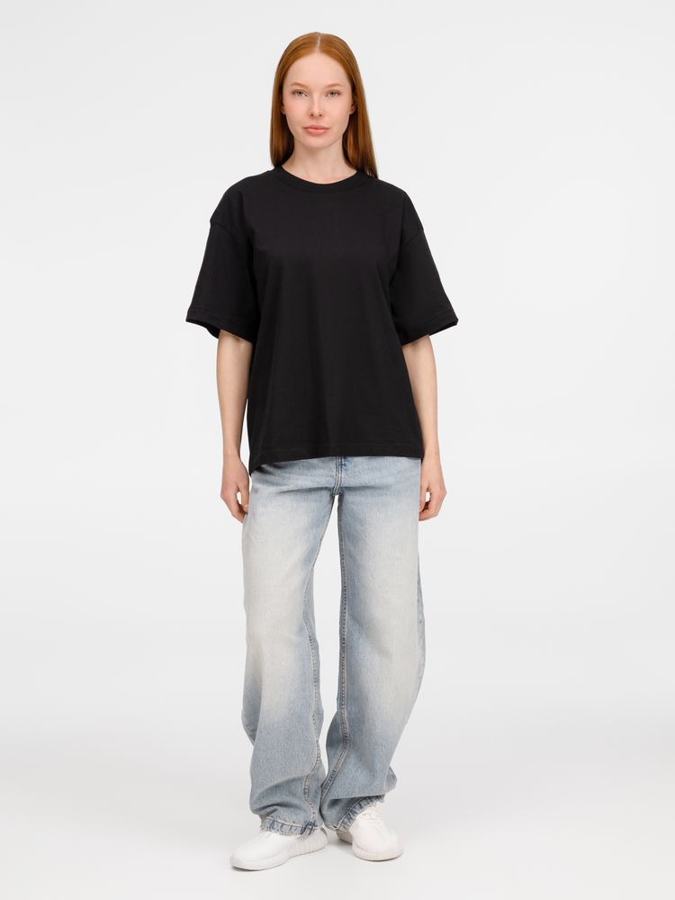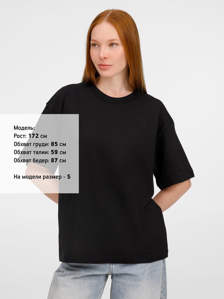 Футболка оверсайз унисекс с круглым вырезом и без боковых швов. Выполнена из смеси органического и обычного хлопка. Благодаря повышенной плотности отлично держит форму.