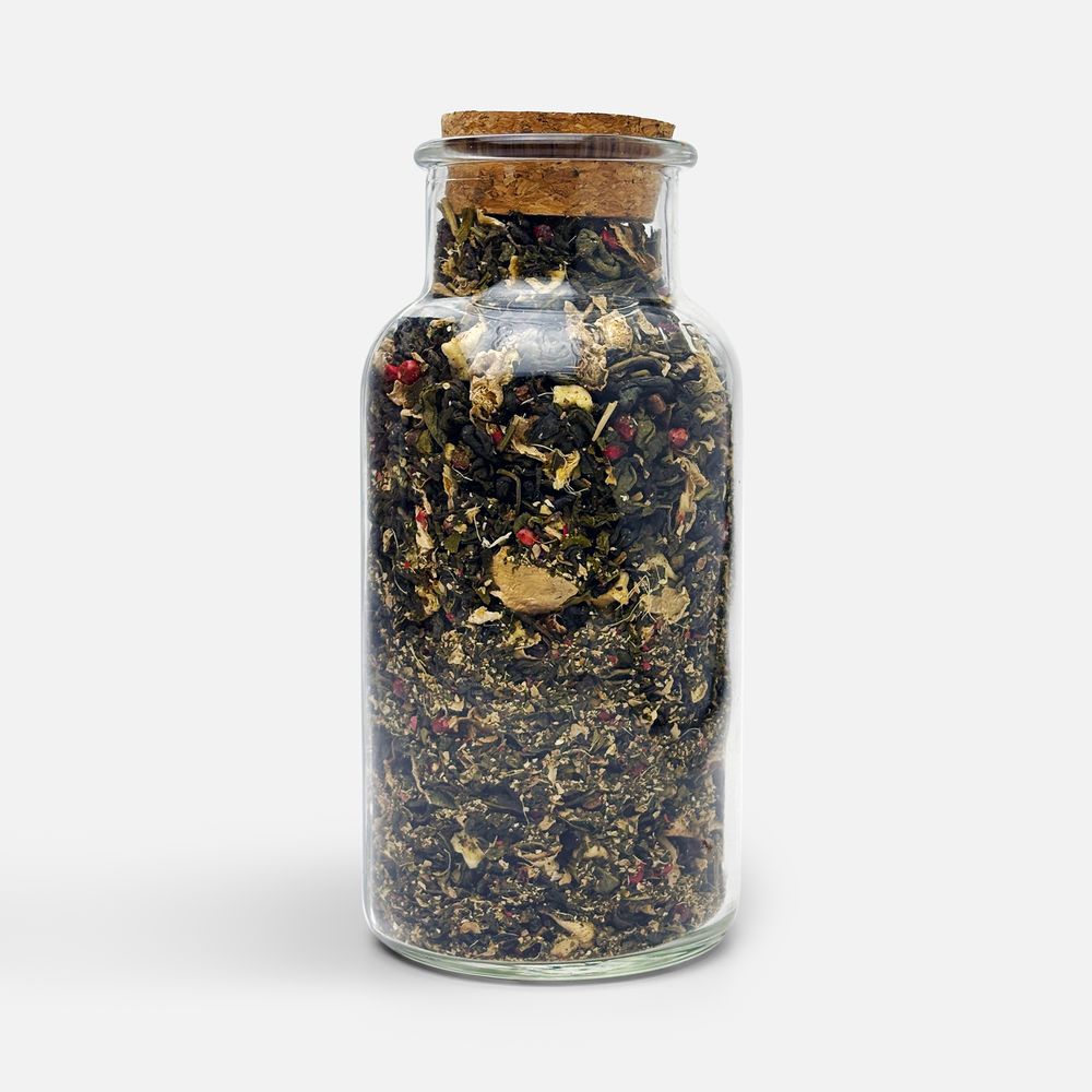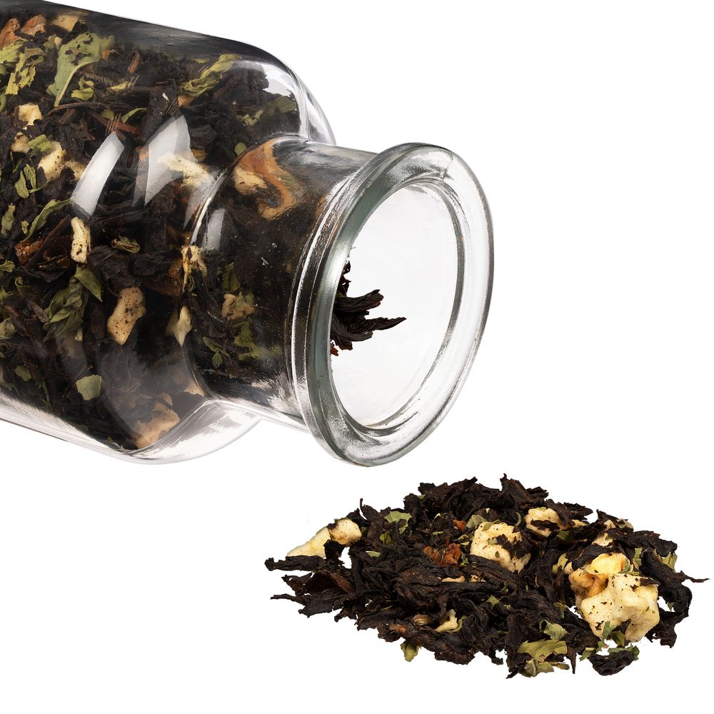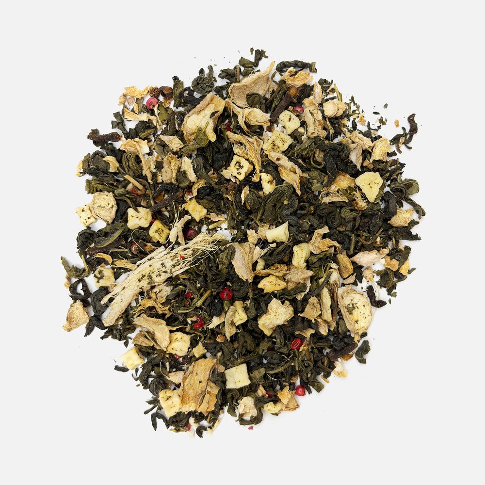 Состав: чай зеленый с имбирем и соком имбиря (чай зеленый байховый крупнолистовой, кусочки имбиря, сок имбиря), яблоко сублимированное, розовый перец, гвоздика, ароматизатор Персик, ароматизатор Яблоко.