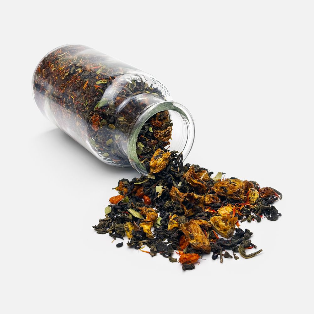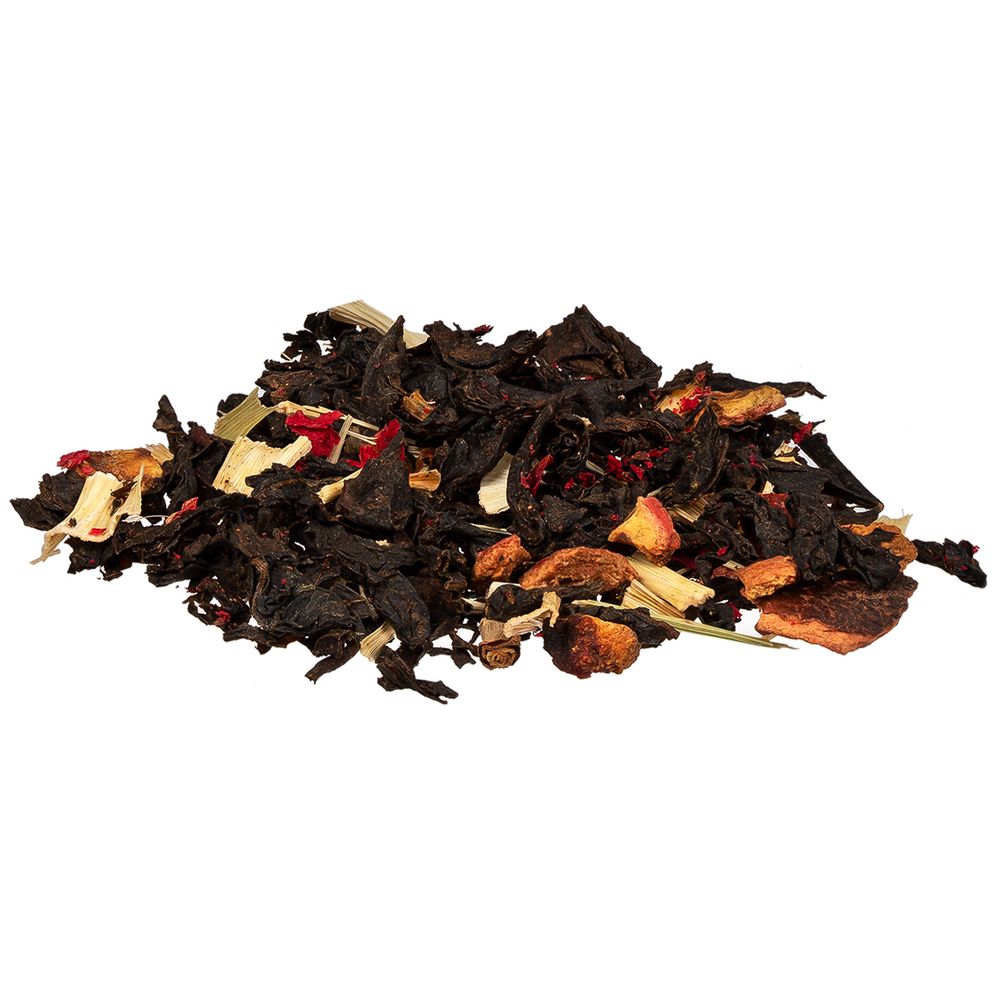 Черный крупнолистовой чай с апельсиновой цедрой, кусочками имбиря и сублимированной малиной обладает многогранной палитрой вкуса и аромата. В состав чая входят только натуральные ингредиенты, а чайные листья предварительно вымачиваются в имбирном соке: вкус напитка становится особо насыщенным и обогащенным.