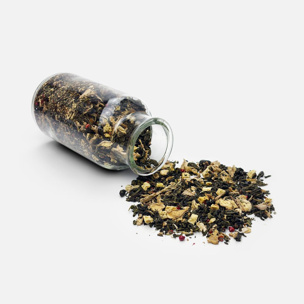 Зеленый крупнолистовой чай с кусочками имбиря, яблоком, гвоздикой и розовым перцем обладает многогранной палитрой вкуса и аромата. В состав чая входят только натуральные ингредиенты, а чайные листья предварительно вымачиваются в имбирном соке: вкус напитка становится особо насыщенным и обогащенным.