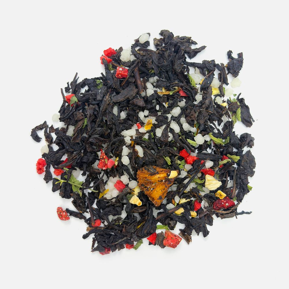 Черный крупнолистовой чай с кусочками ананаса, вишни, лемонграссом, цветками и коркой граната обладает многогранной палитрой вкуса и аромата. В состав чая входят только натуральные ингредиенты, а чайные листья предварительно вымачиваются в соке ананаса: вкус напитка становится особо насыщенным и обогащенным.