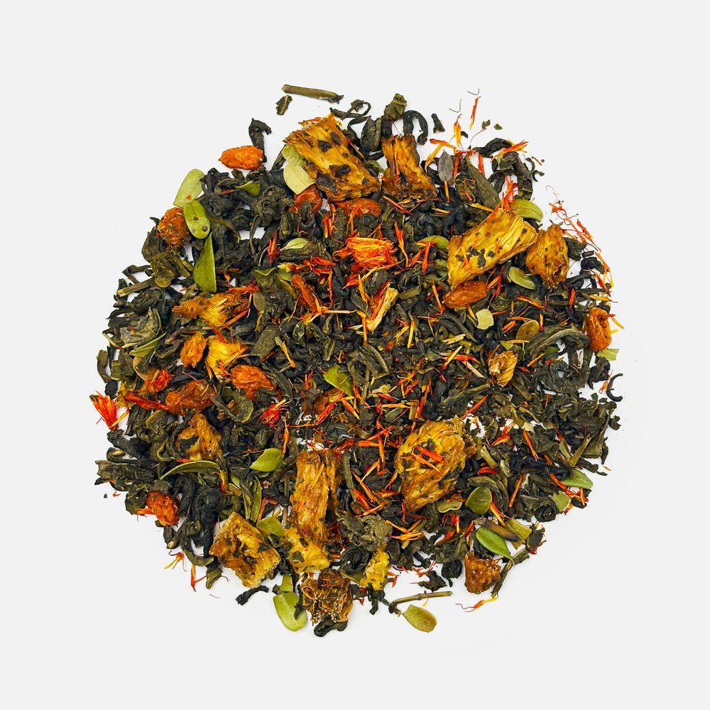 Состав: чай зеленый с ананасом и соком ананаса (чай зеленый байховый крупнолистовой, кусочки ананаса, сок ананаса), цветки сафлора, толокнянка, облепиха сублимированная, ароматизатор натуральный Персик, ароматизатор натуральный Груша.