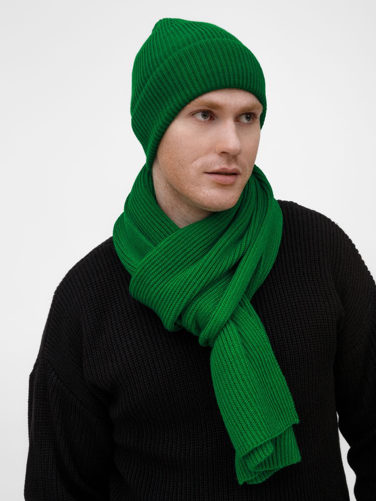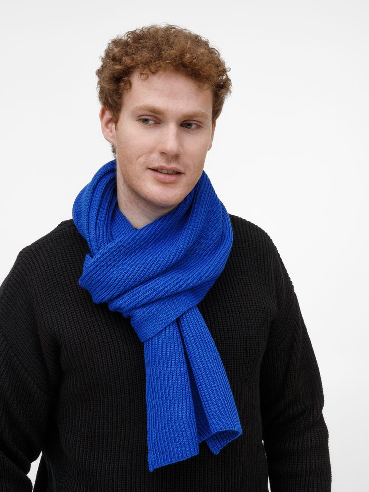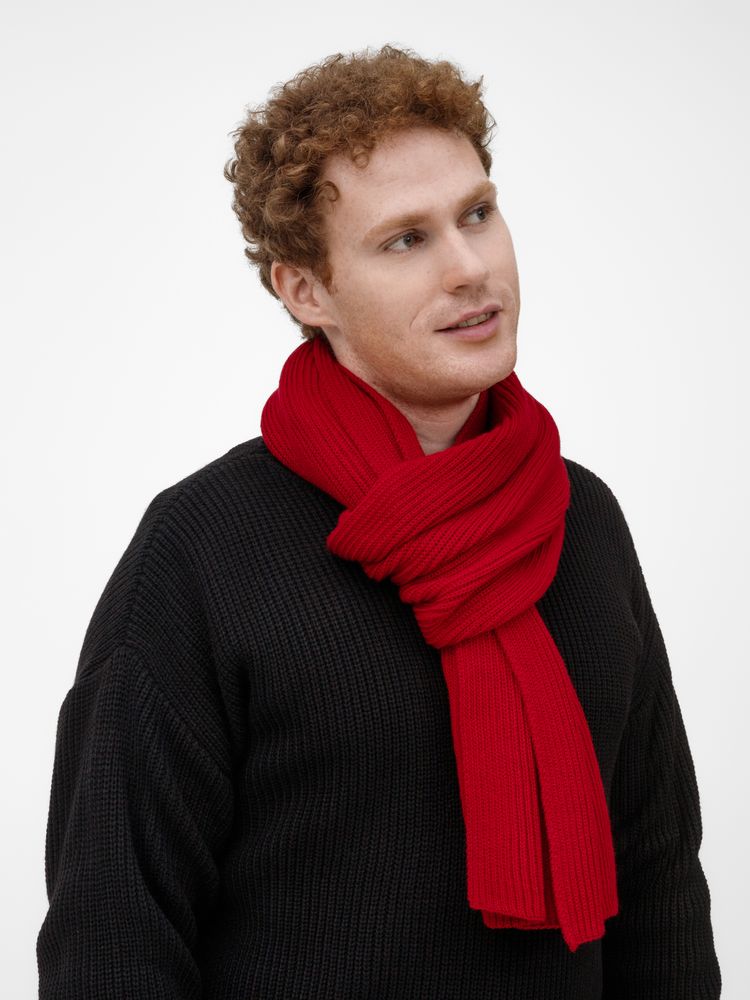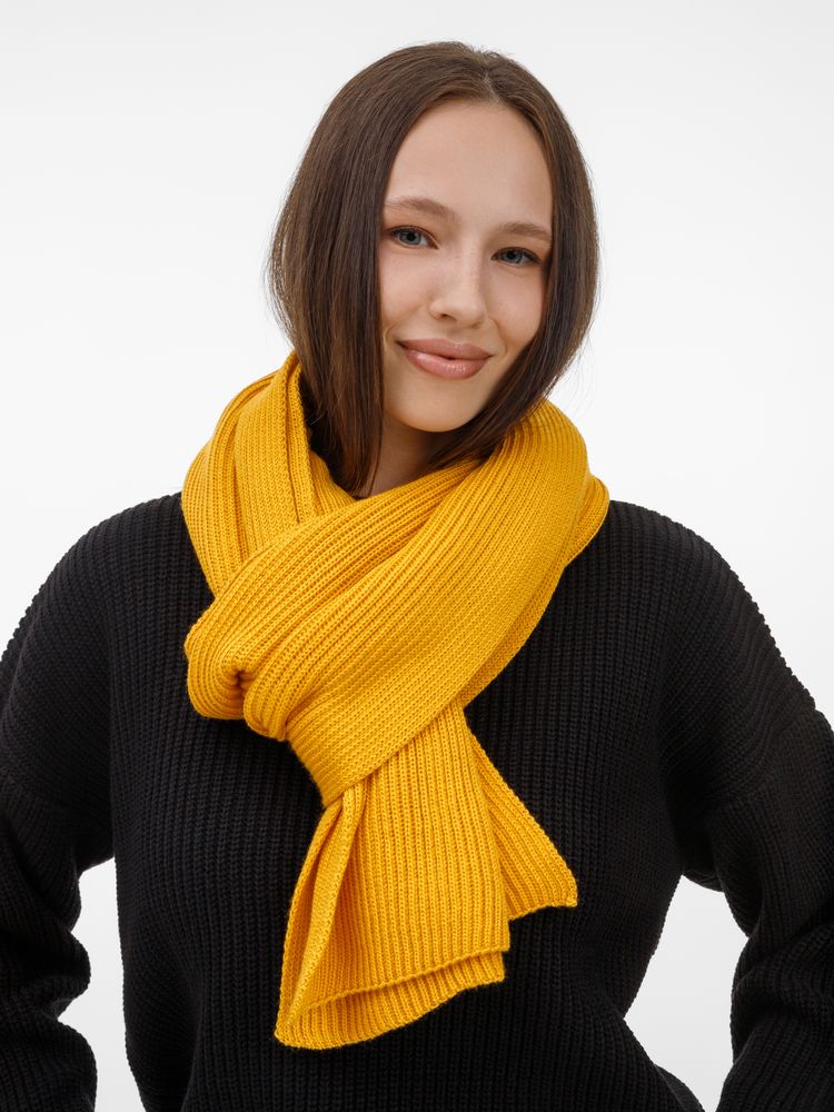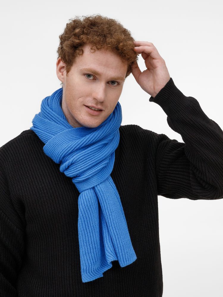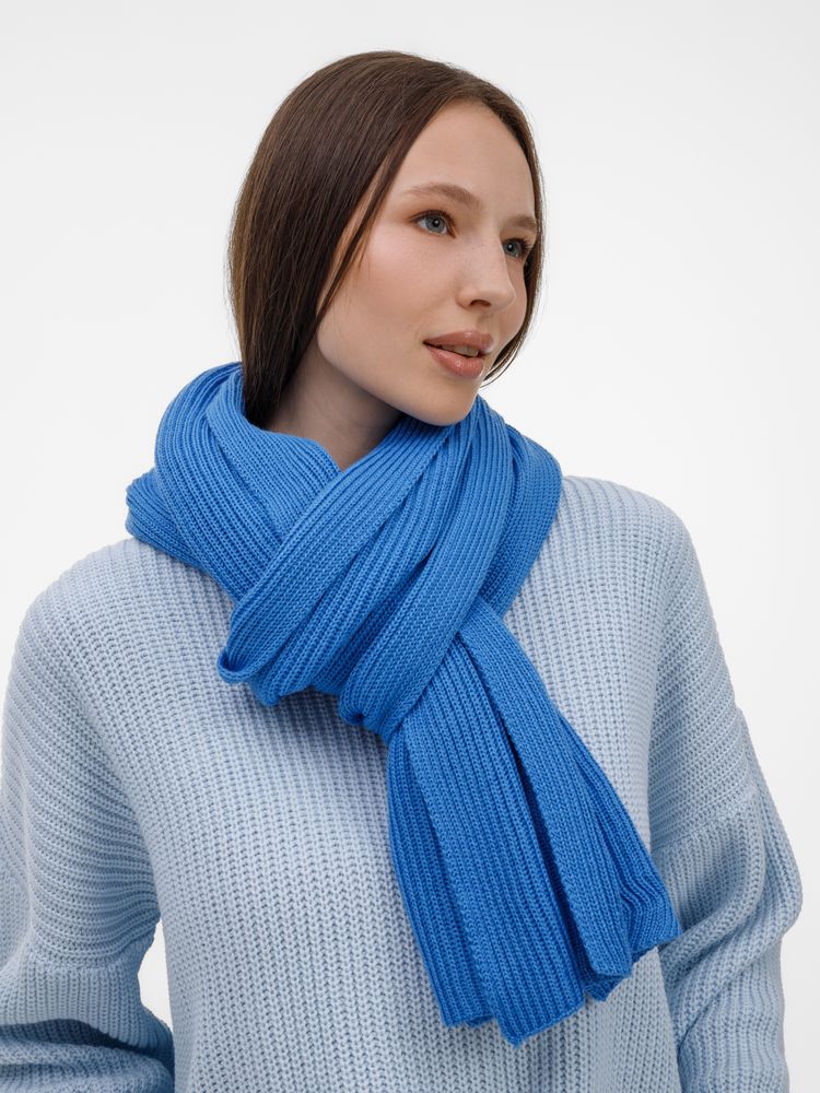 Широкий шарф из мягкой полушерстяной пряжи с выразительной фактурной вязкой создает современный запоминающийся образ.