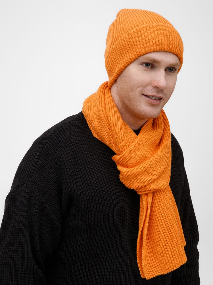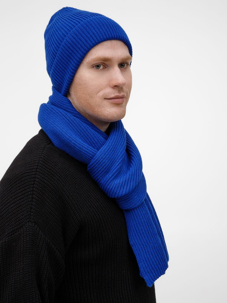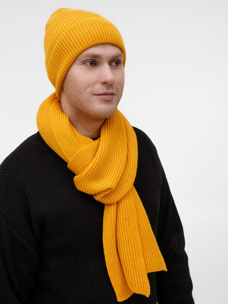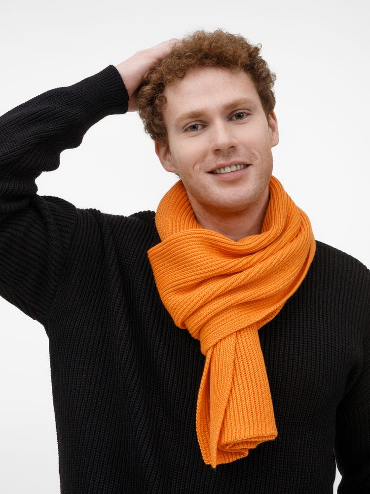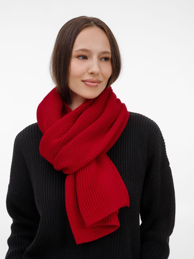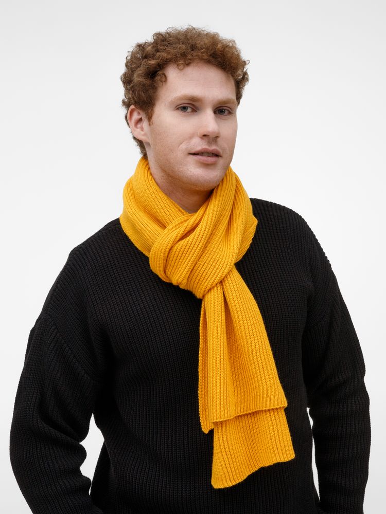 Широкий шарф из мягкой полушерстяной пряжи с выразительной фактурной вязкой создает современный запоминающийся образ.