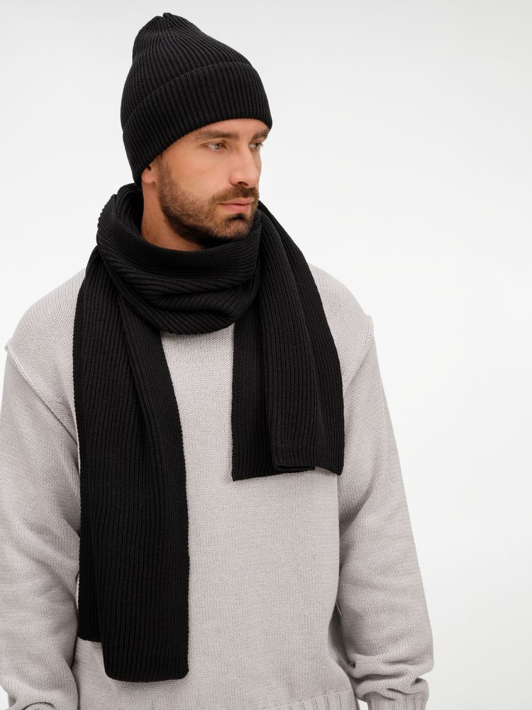 Удлиненная шапка с широким отворотом и фактурной вязкой мягко облегает голову, создавая элегантный силуэт. Широкий шарф с выразительным рельефом позволяет экспериментировать с драпировками, добавляя образу объем и динамику. Перчатки с аккуратной резинкой на манжете обеспечивают идеальную посадку и тактильный комфорт.