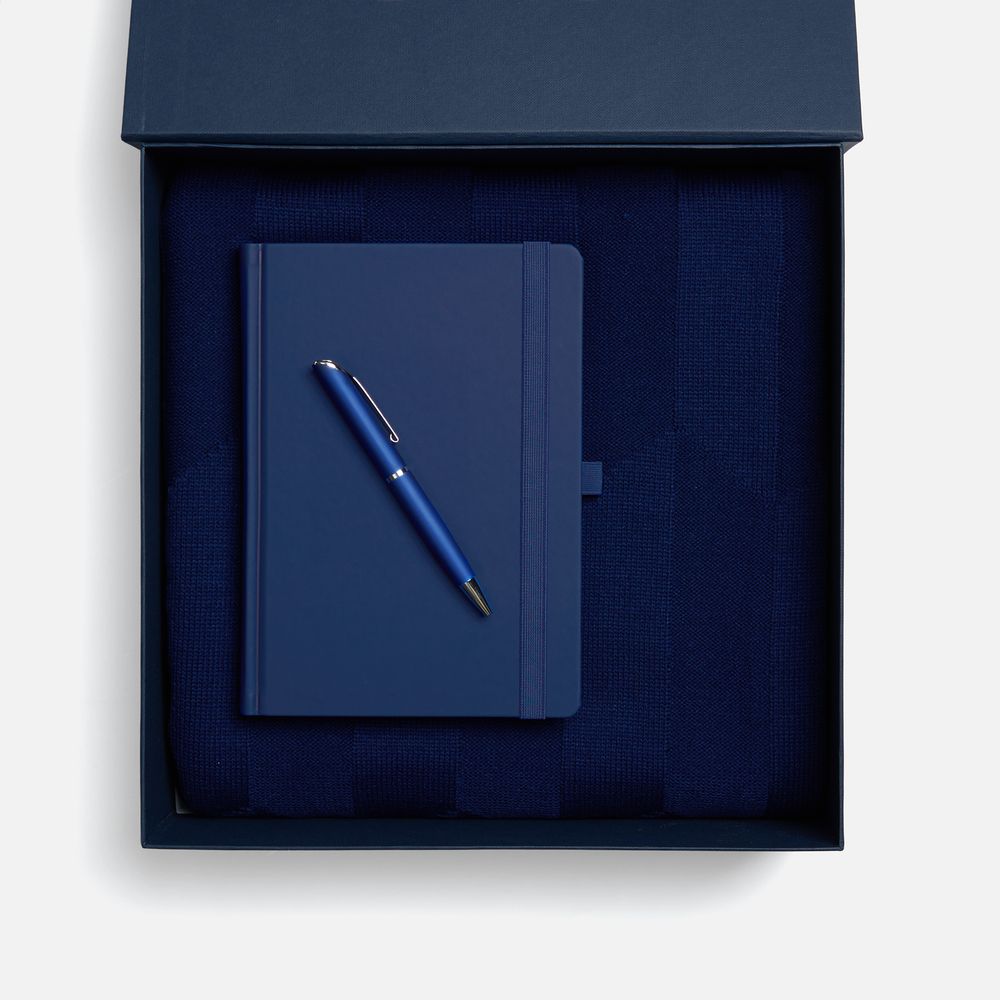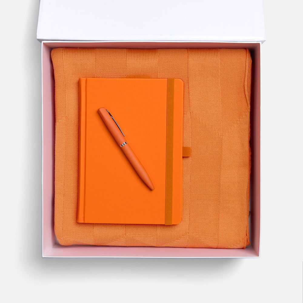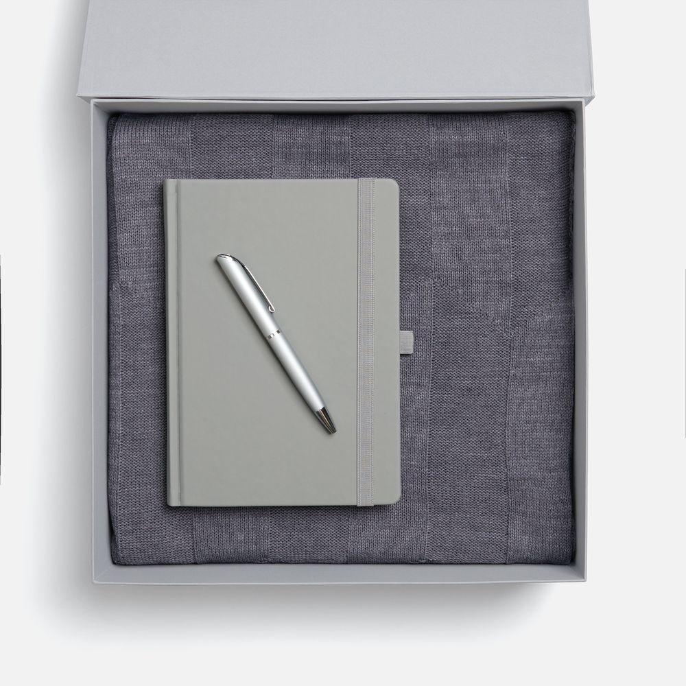 Однотонный набор с основной канцелярией и пледом — классика жанра в уютном исполнении. С компактным ежедневником будет удобно делать заметки в любое время — благодаря петельке для ручки любимый пишущий инструмент будет всегда под рукой. А изысканный акриловый плед с геометрическим узором позволит выразить самые теплые пожелания и ддобавит плавных линий в интерьер.