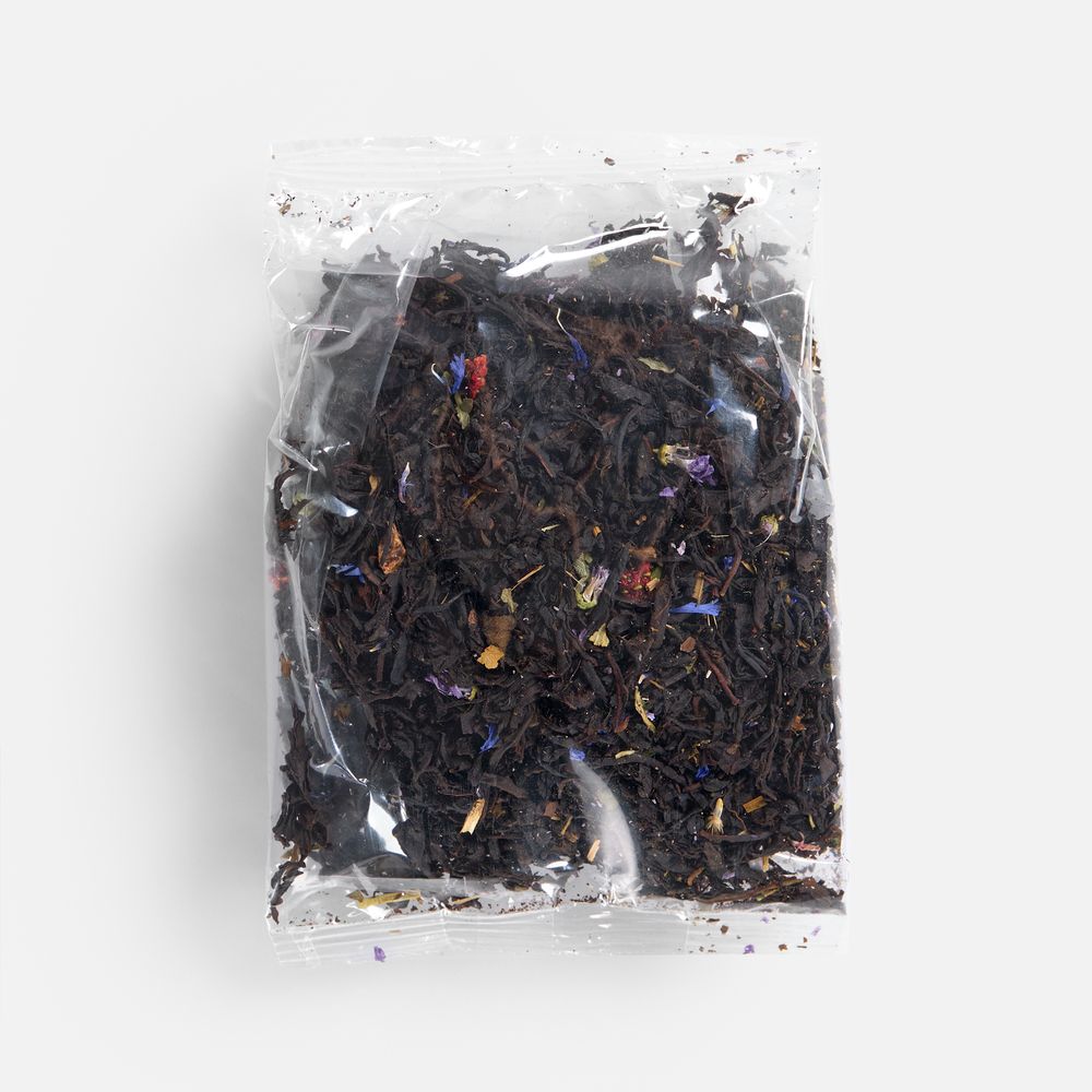 Состав: черный индийский чай, сушеная клубника, клубничный лист, цветки василька, ароматизатор «клубника».