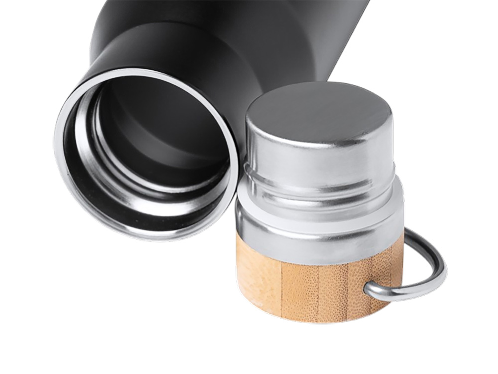 Термобутылка из нержавеющей стали 304 с двойной стенкой и бамбуковой крышкой. Объем: 550 мл. Упакована в экологичную коробку.