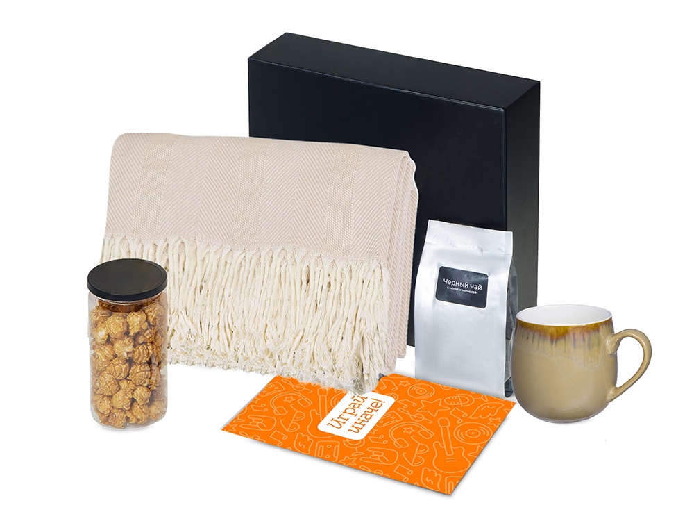 Материал товара: плед - 100% хлопок, кружка - костяной фарфор с покрытием soft-touch,чай - пластик, попкорн - пластик, металл, мешок - нетканый материал (спандонд), коробка - картон