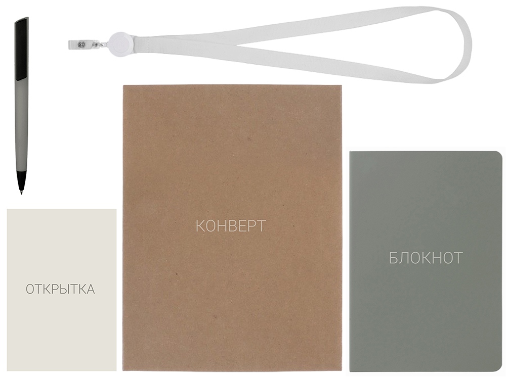 Материал товара: блокнот - искусственная кожа, открытка - бумага, пакет - картон, ручка - пластик с покрытием soft-touch, ланьярд с ретрактором - полиэстер, металл, пластик.