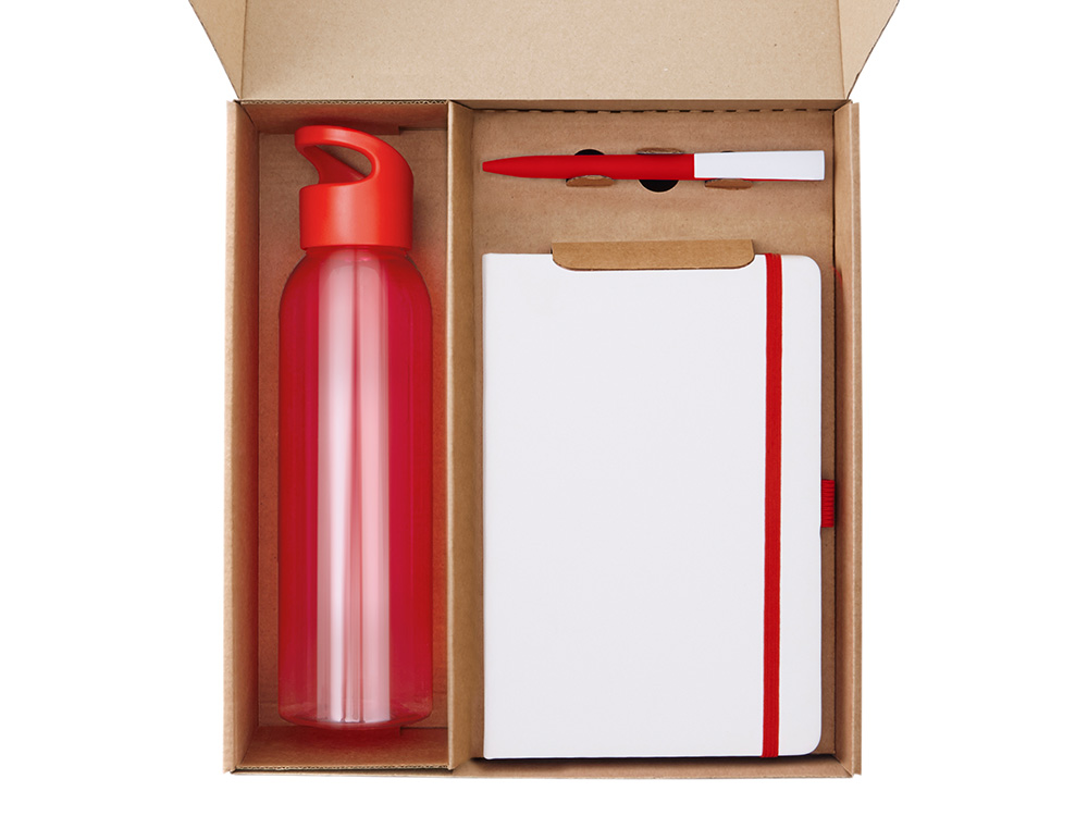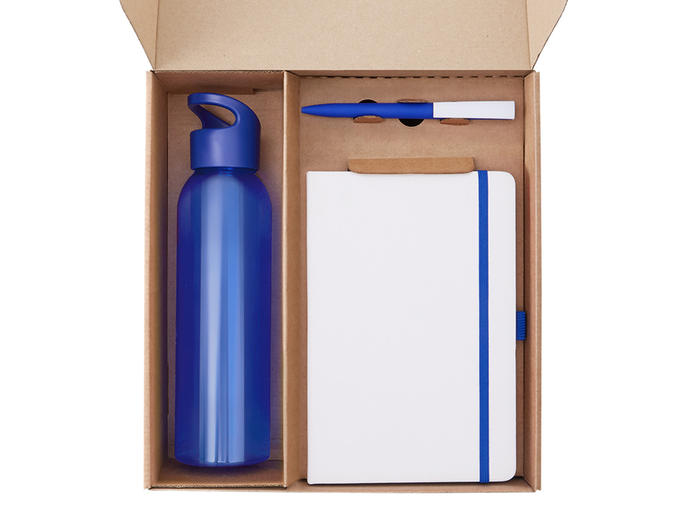 Материал товара: бутылка -поликарбонат, блокнот - искусственная кожа, бумага, ручка - пластик с покрытием soft-touch, держатель - пластик, ланчбокс - пластик, открытка - картон, коробка - картон