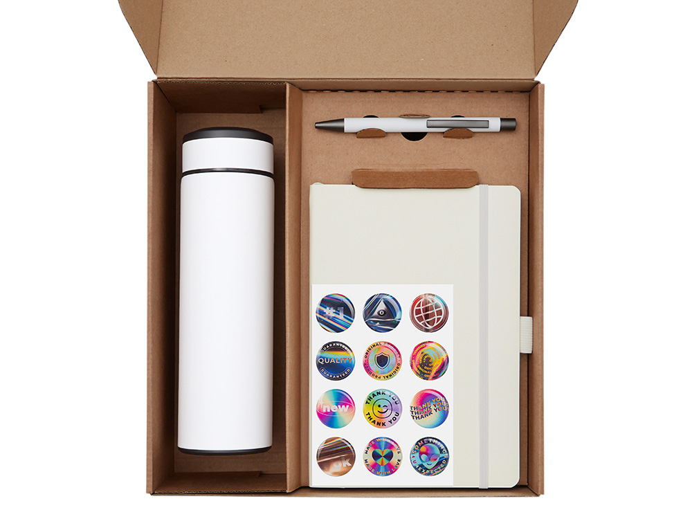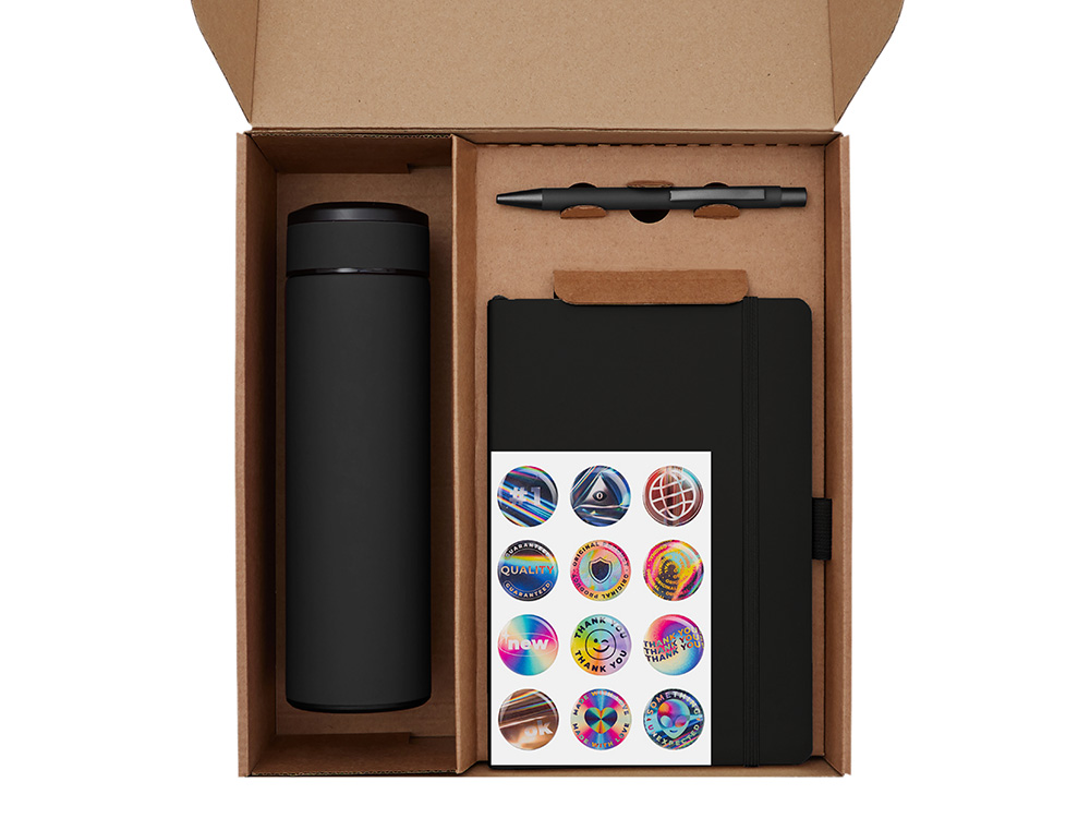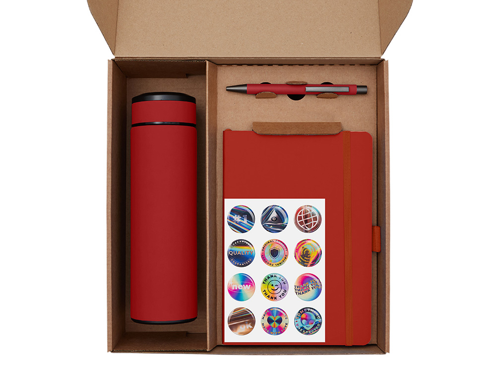 Материал товара: термос - нержавеющая cталь с покрытием soft-touch, блокнот - искусственая кожа soft-touch, ручка - металл с поверхностью soft-touch, чай - крафт-пакет, стикеры - смола, держатель для телефона - пластик, коробка - картон