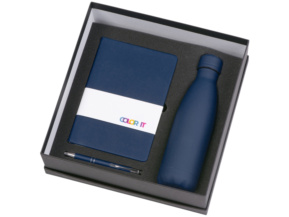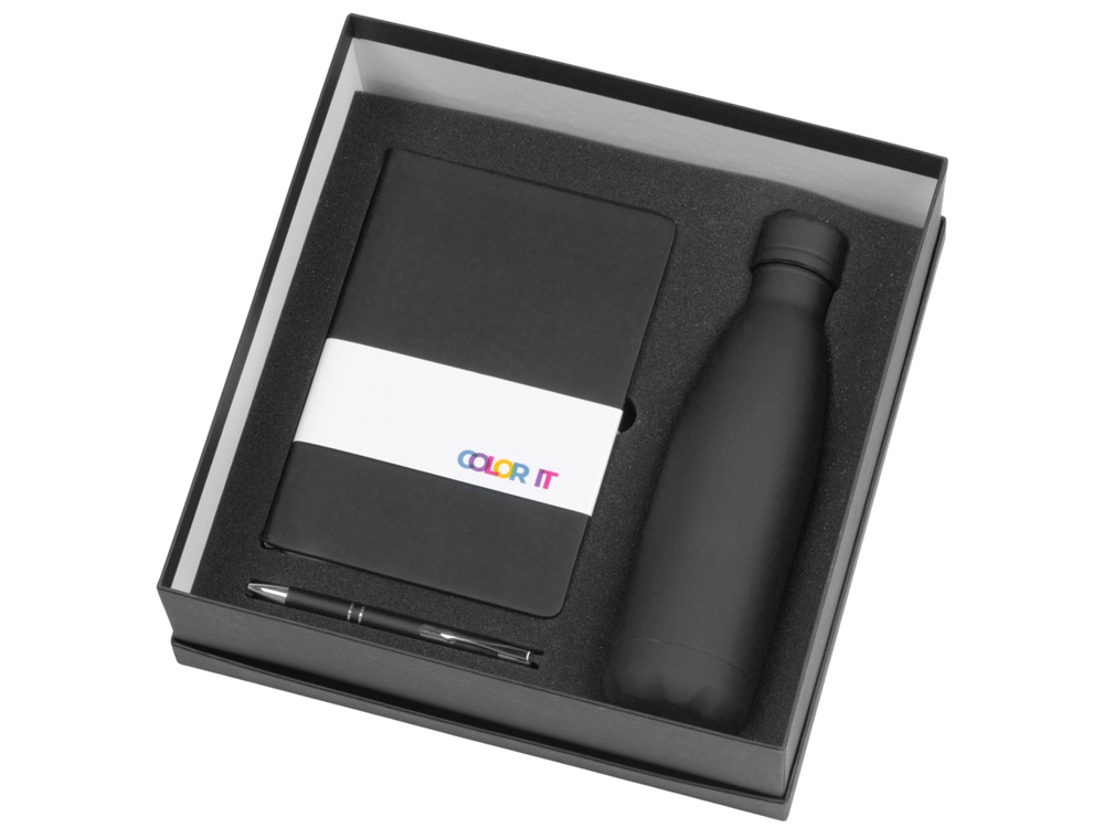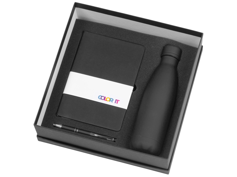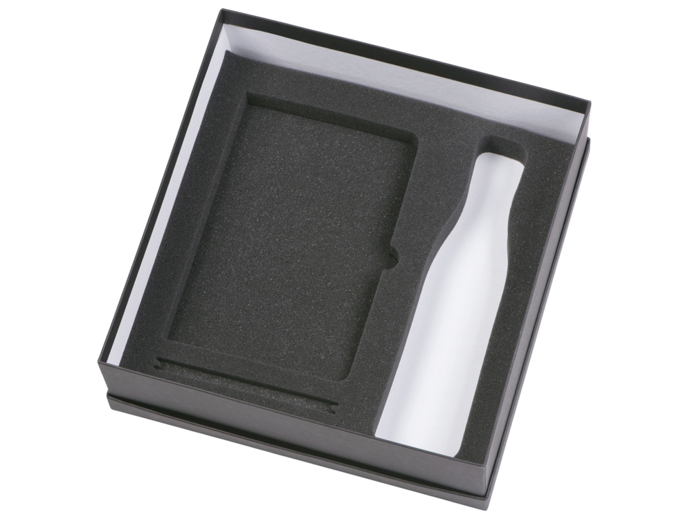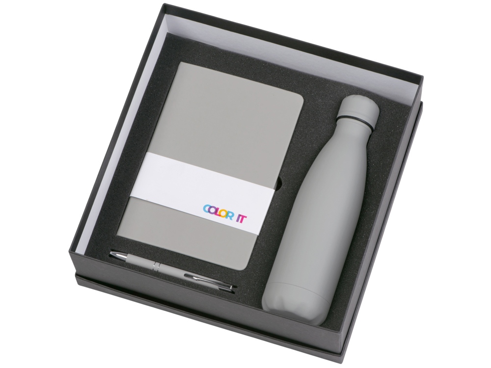 Материал товара: блокнот - искусственная кожа с покрытием soft-touch, ручка - алюминий с покрытием soft-touch, термобутылка - нержавеющая cталь с покрытием soft-touch, коробка - картон