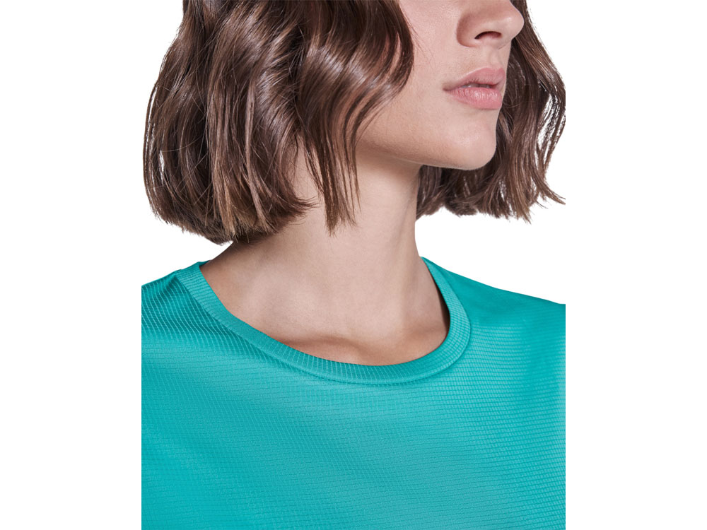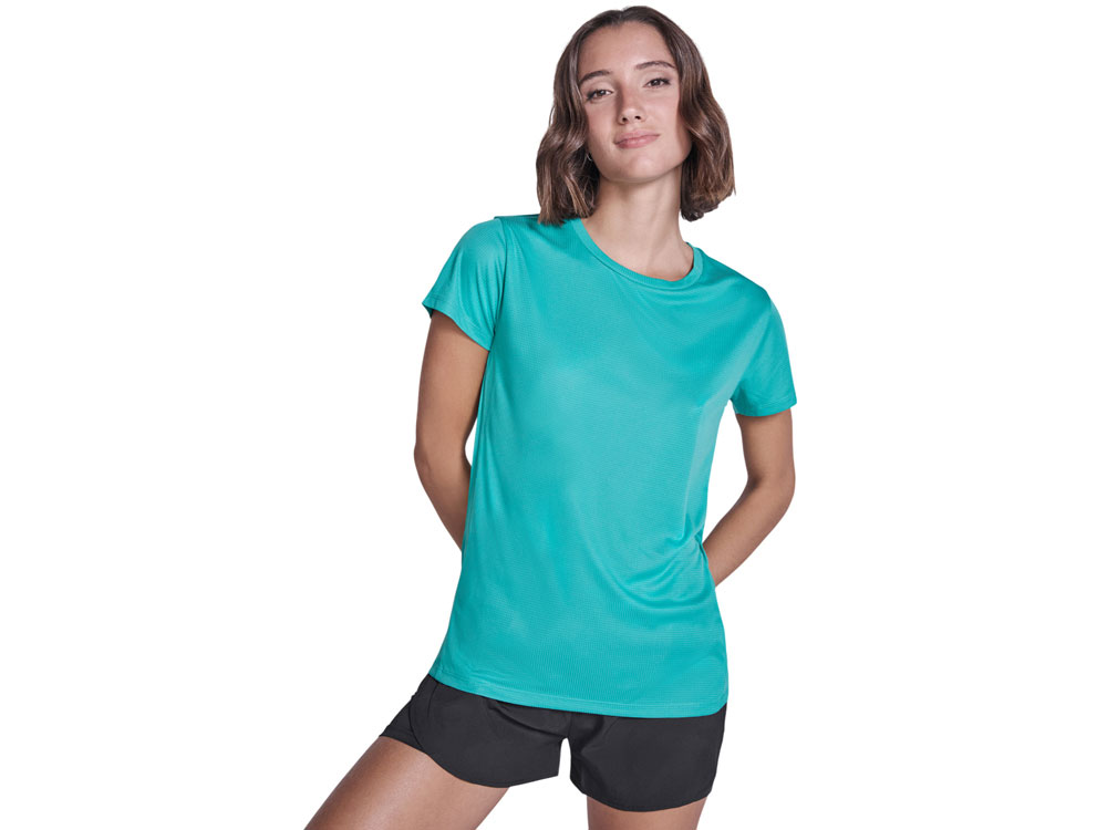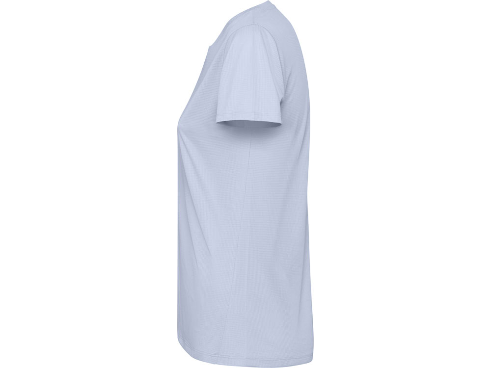 Женская футболка с коротким рукавом из технологичного полотна. Отстрочки в тон. Спинка с удлинением. Боковые швы со смещением вперед.
