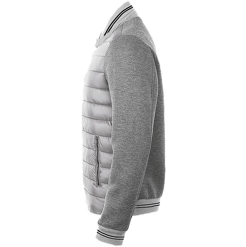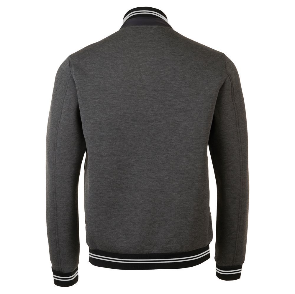 Круглый ворот с кнопкой, 2 кармана на молнии. Контрастные полоски на воротнике и манжетах.