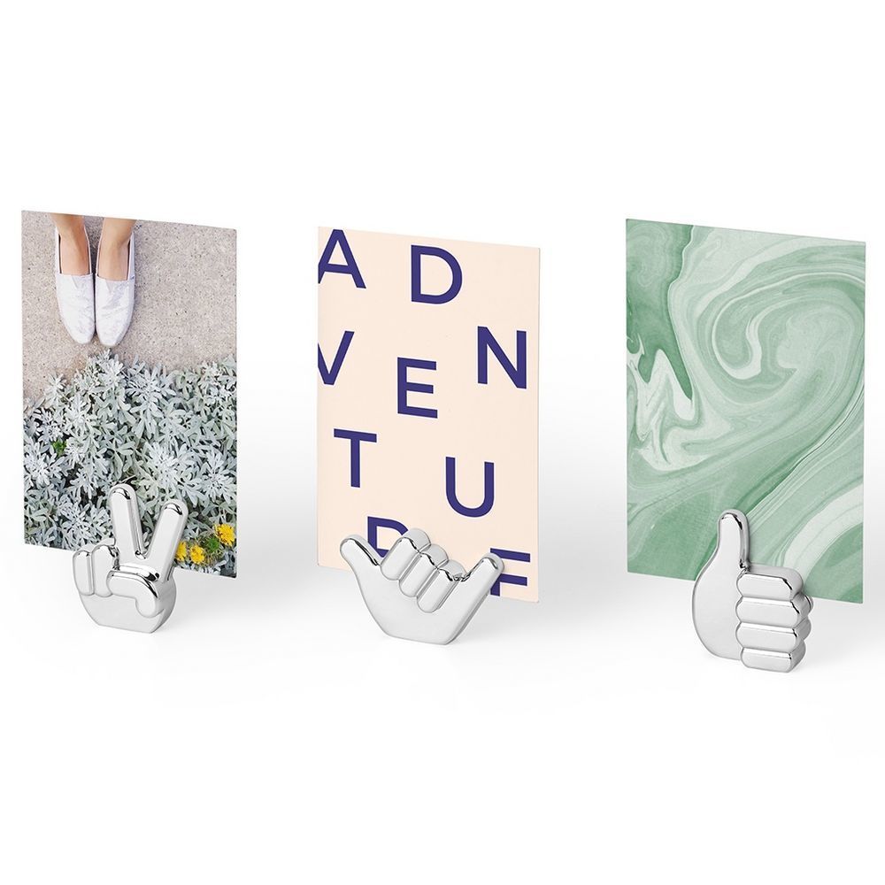 Держатели для фотографий в виде популярных дружеских жестов — отличное решение для быстрого декора. Просто вставьте фото, записку или открытку в прорезь и поставьте на видное место.