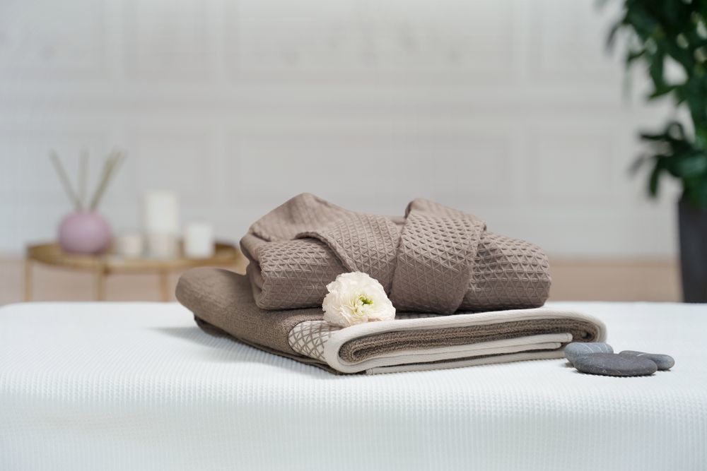 Двустороннее полотенце: с одной стороны фактурное плетение, напоминающее вафельное, с другой — привычные петли махровой ткани.