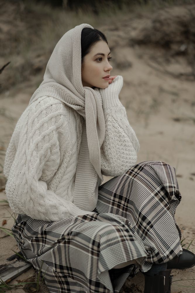 Сочетание различных типов вязки делает косынку по-настоящему интересным предметом гардероба. Ее можно носить на шее как шарф, на голове — вместо шапки или сделать ее самостоятельным акцентом образа.