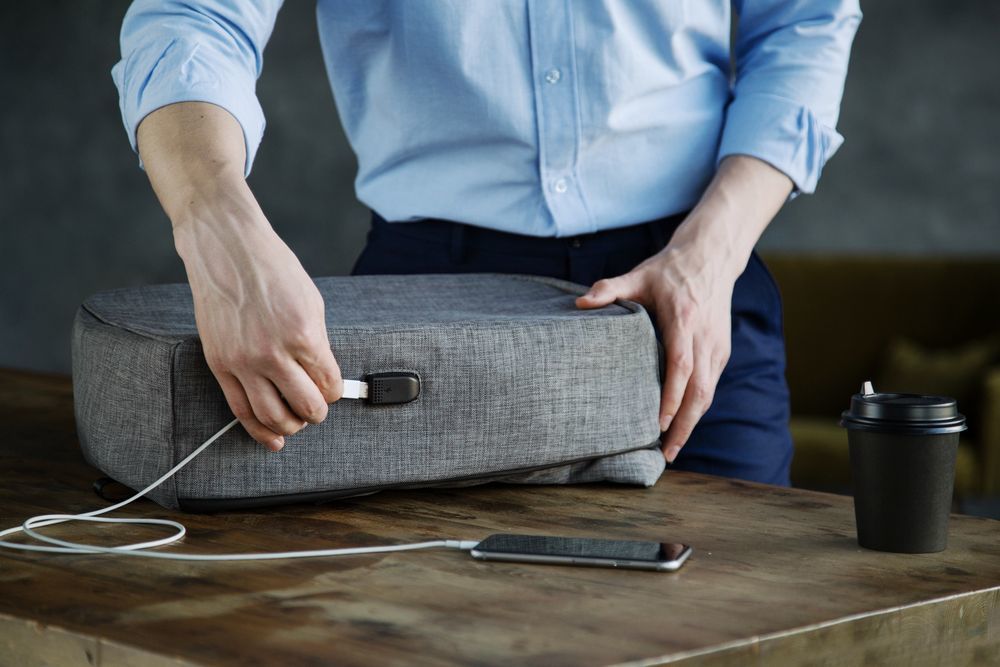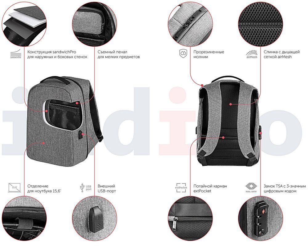 - Внешний USB-порт для зарядки гаджетов (внутри рюкзака — провод для подключения и карман для размещения аккумулятора)
