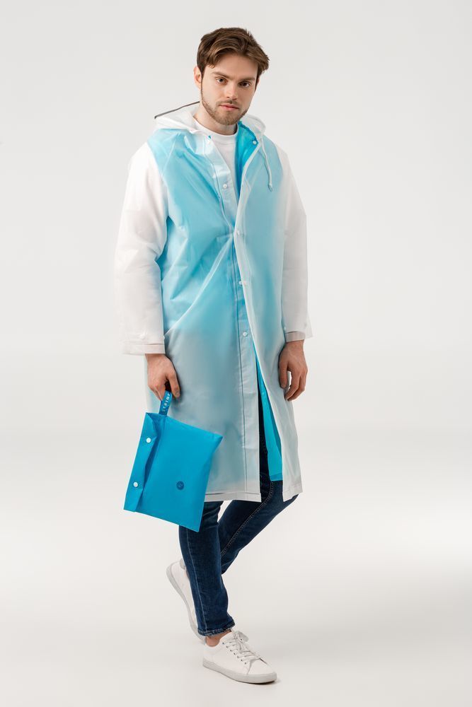 Плащ-дождевик на кнопках с капюшоном. Складывается в чехол — удобно брать с собой.
