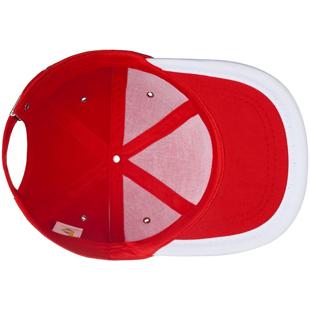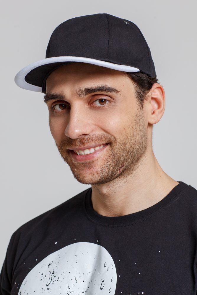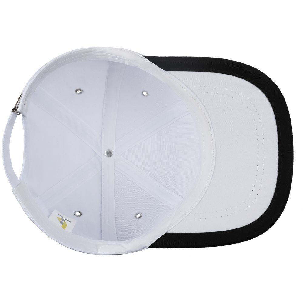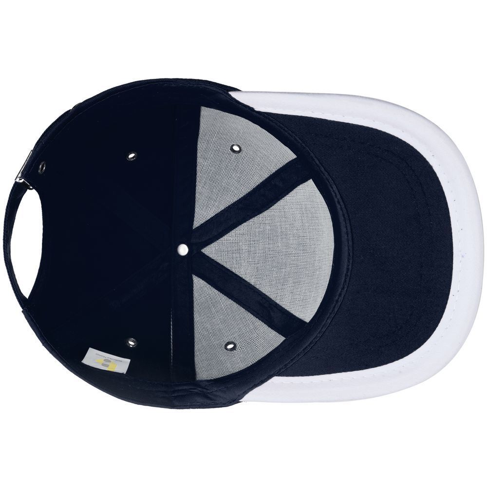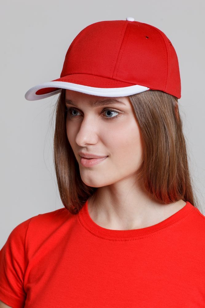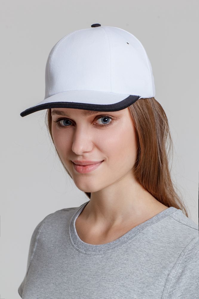 Шесть клиньев без шва на лбу, широкий контрастный кант на козырьке, пуговица в тон канту, металлическая застежка, люверсы в тон ткани.