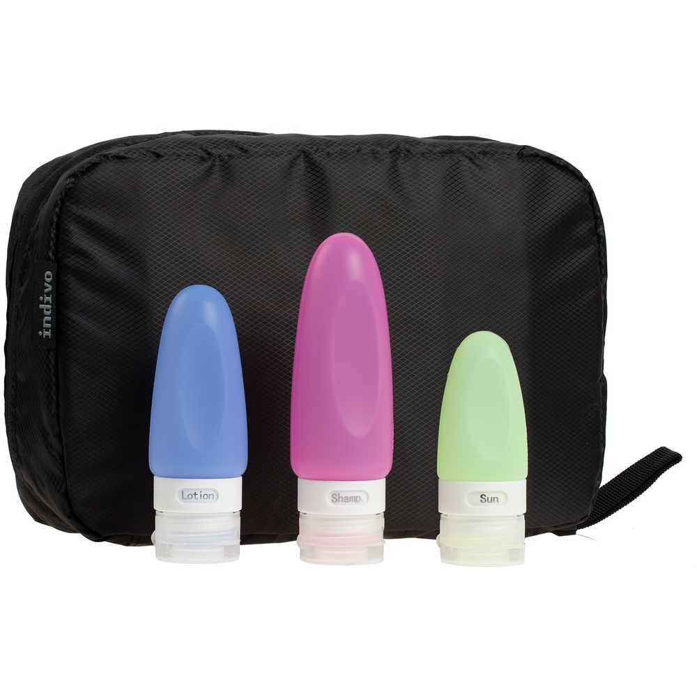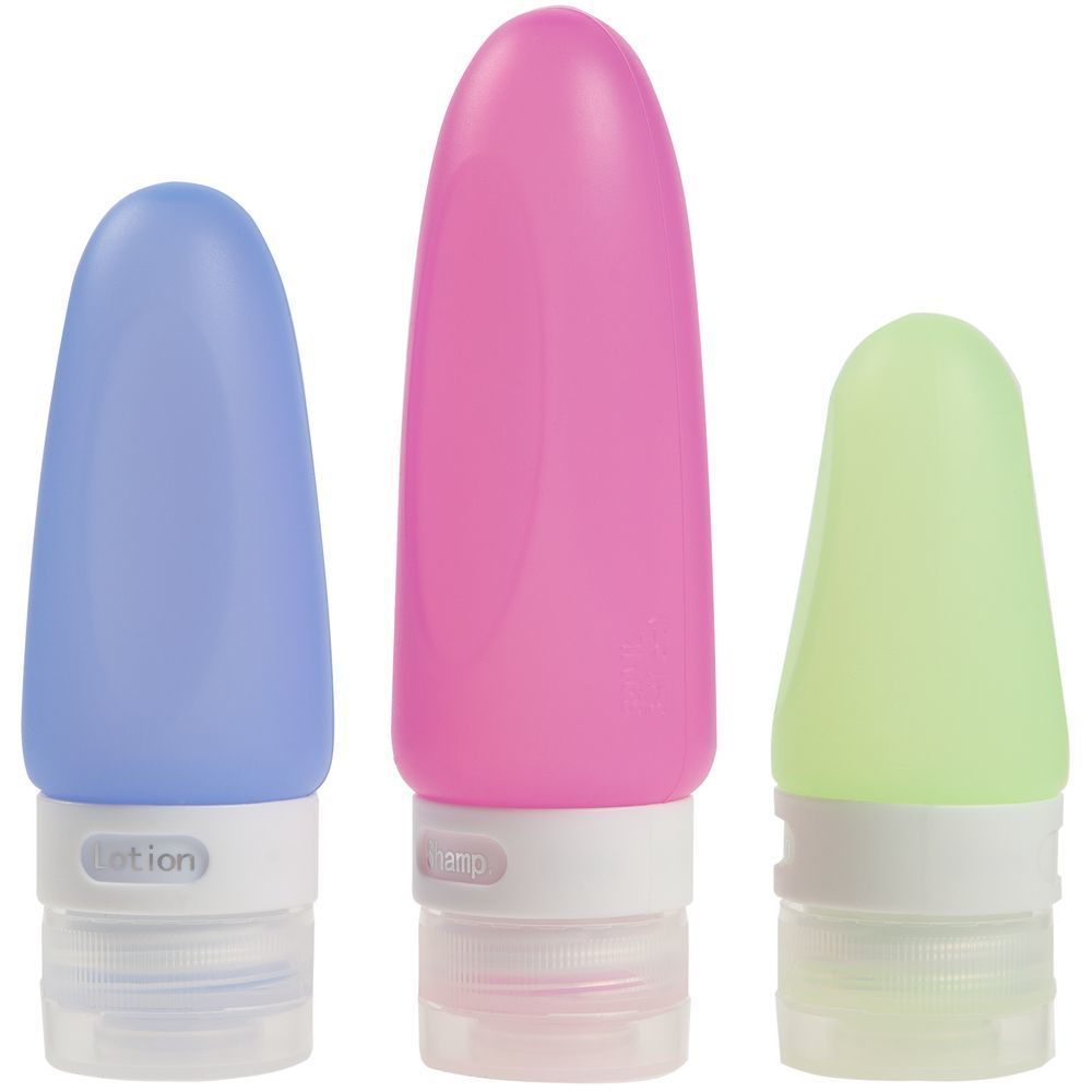 - Три емкости для косметики в комплекте: 37 мл, 60 мл, 87 мл. На каждой емкости есть маркировки для обозначения содержимого: шампунь (Shamp.), мыло (Soap), лосьон для тела (Lotion), кондиционер (Cond.), солнцезащитное средство (Sun) и пустое поле для вашей собственной подписи.