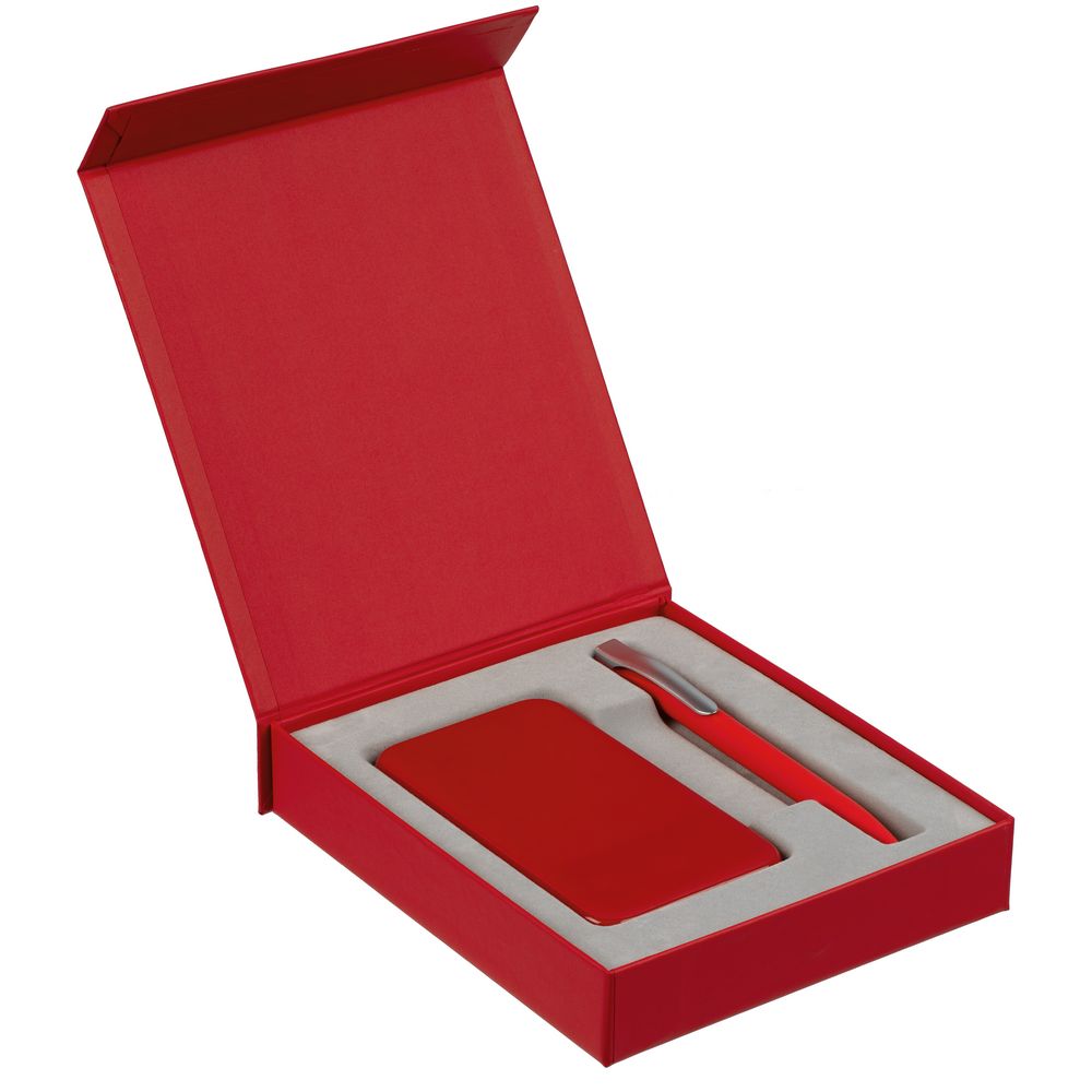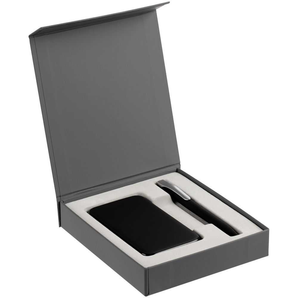 Подарочная коробка для аккумулятора 12,3х7,1х1 см и ручки 14,5х1,5х0,8 см с крышкой на магните и флокированным ложементом.