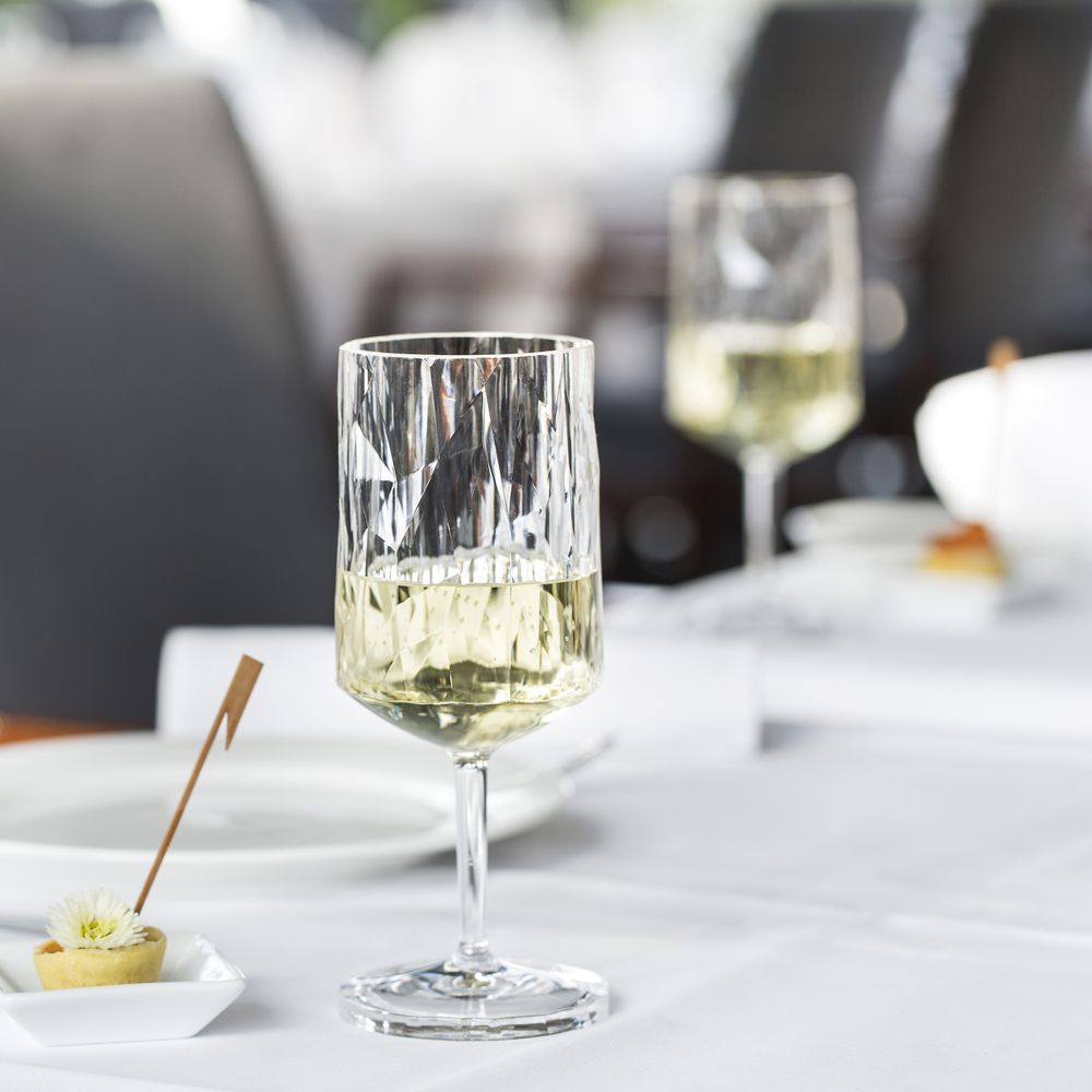 Небьющийся бокал для вина Superglas Club, похожий на драгоценный кристалл, — прекрасное решение для торжества на свежем воздухе. Прочный материал не царапается, не мутнеет и сохраняет напитки холодными дольше, чем традиционные бокалы из стекла.