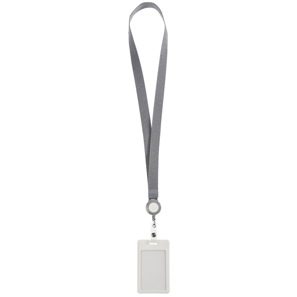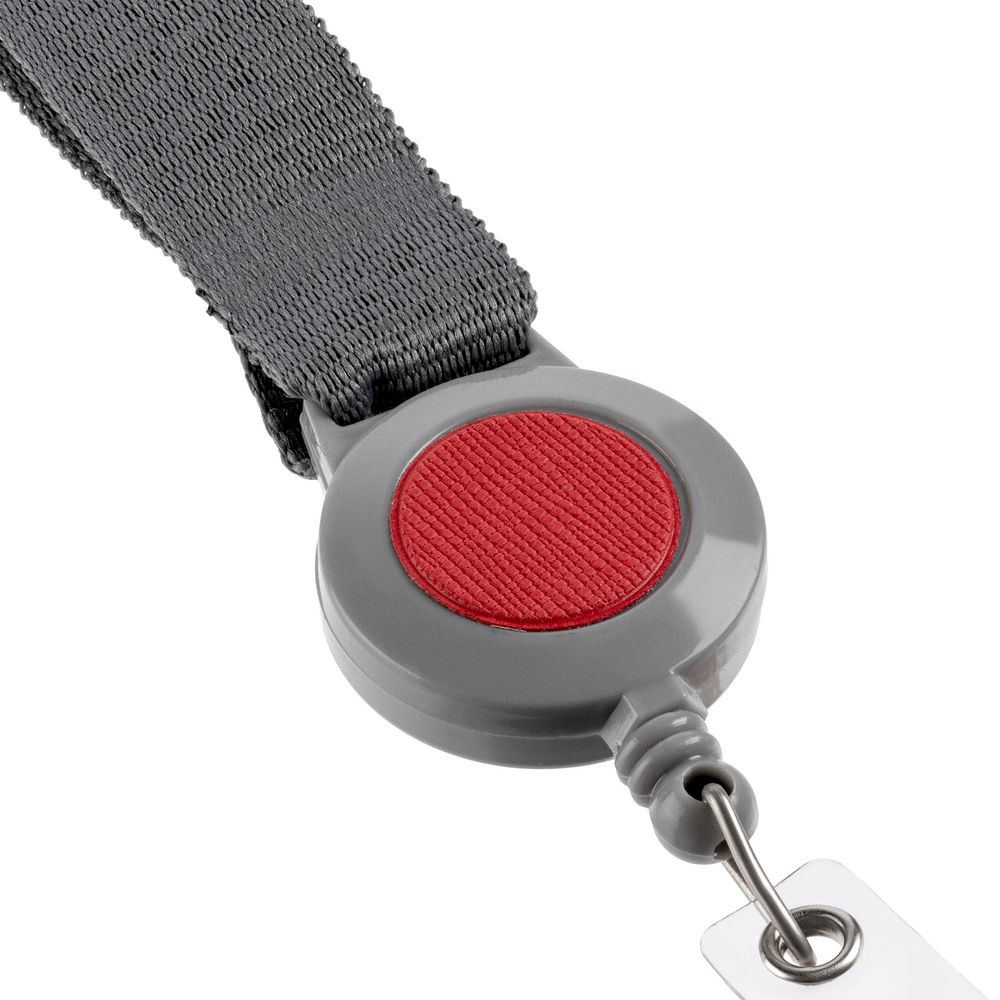 Чехол для пропуска с пластиковым окошком из искусственного материала со съемным пластиковым клипом, прикрепленный пластиковым ретрактором к ленте.