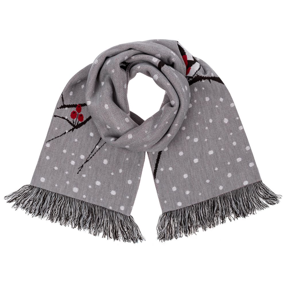 Каждый придумает свою историю, а согреться поможет коллекция Birds and Berries.Двухслойный шарф с жаккардовым рисунком и бахромой по краю.