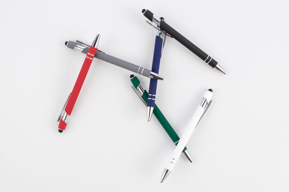 Шариковая ручка с покрытием софт-тач, эффектными хромированными элементами и стилусом.