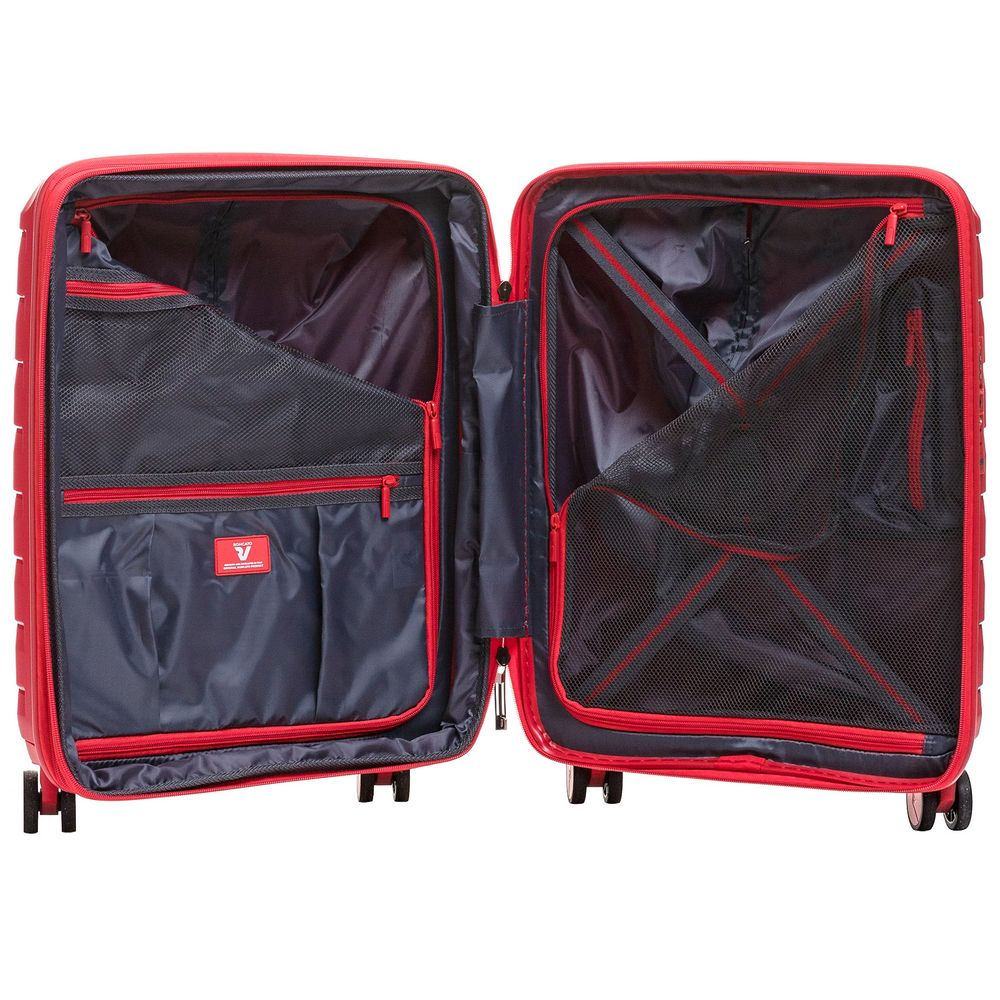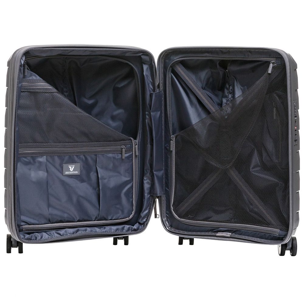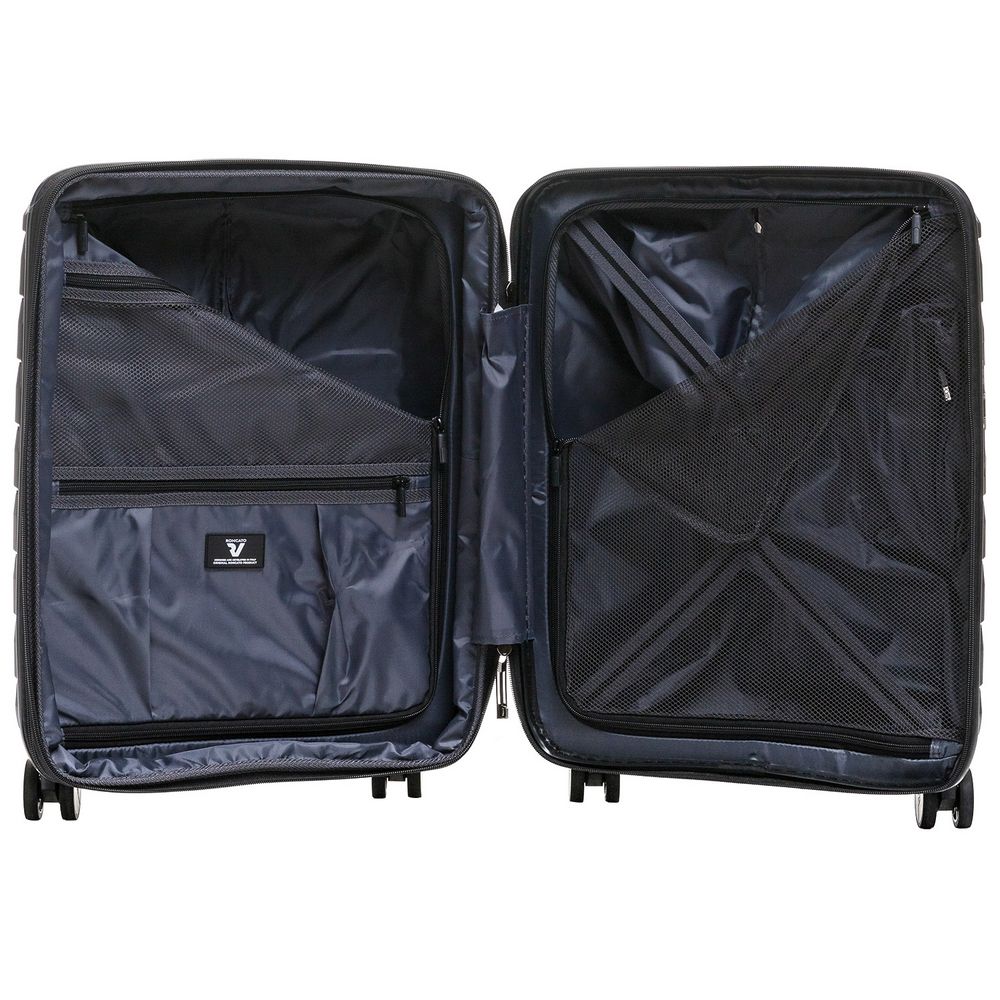 - Чемодан с 2 отделениями: одно из них с фиксирующими ремнями и сетчатой шторкой на молнии, второе — с разделителем на молнии