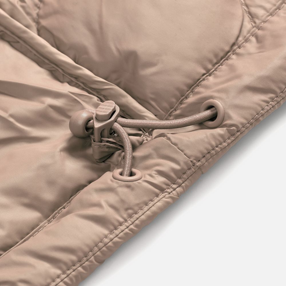 - Кулиска по низу изделия — на изнаночной стороне по боковым швам закреплены стопперы для регулировки прилегания по линии бедер