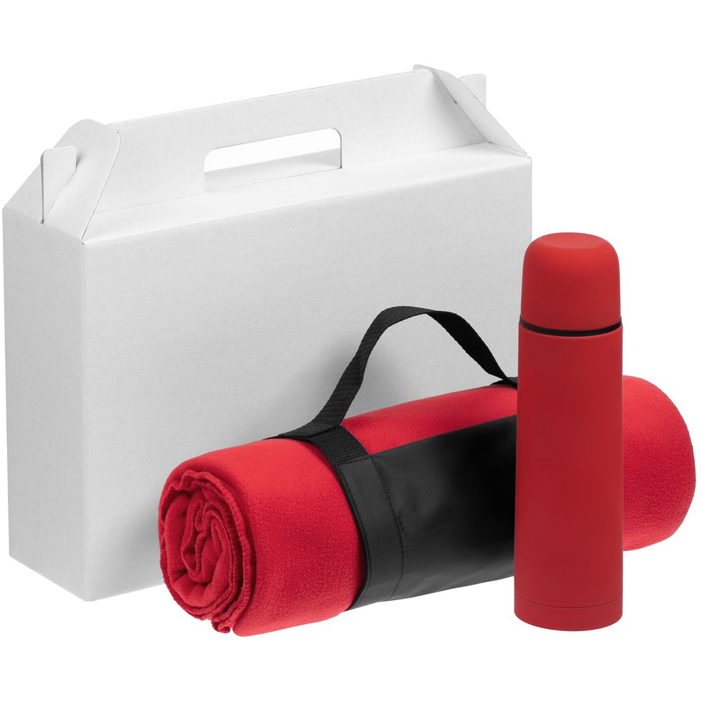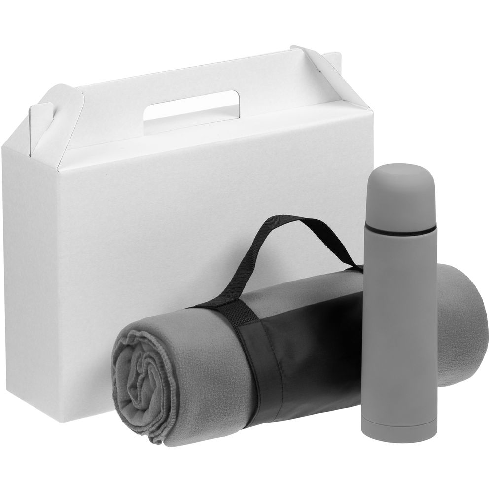 Материал товара: плед - флис, плотность 180 г/м²; термос - нержавеющая сталь, 304 внутри, 201 снаружи, пластик, покрытие софт-тач; коробка - микрогофрокартон