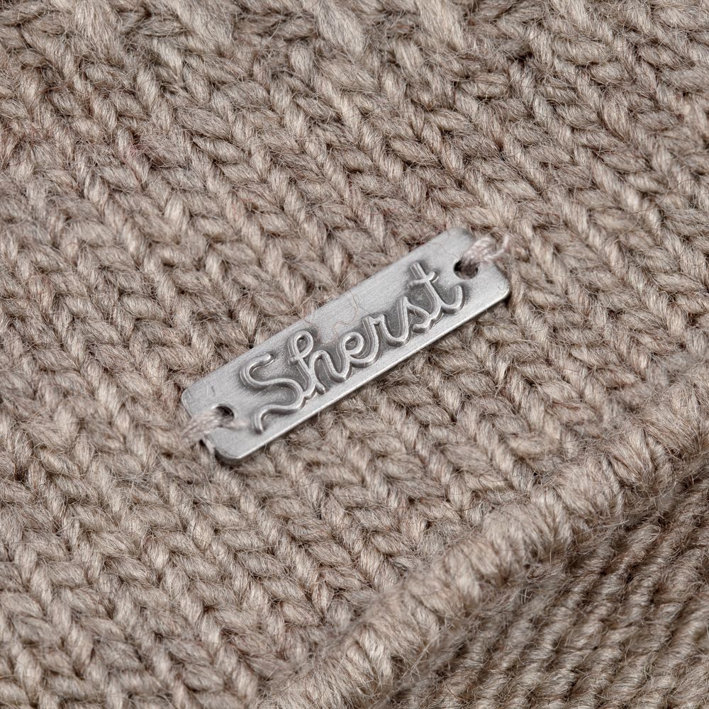 Металлический шильд с названием бренда расположен по нижнему краю изделия, что оставляет достаточно места для пришива лейбла или шильда с логотипом заказчика.