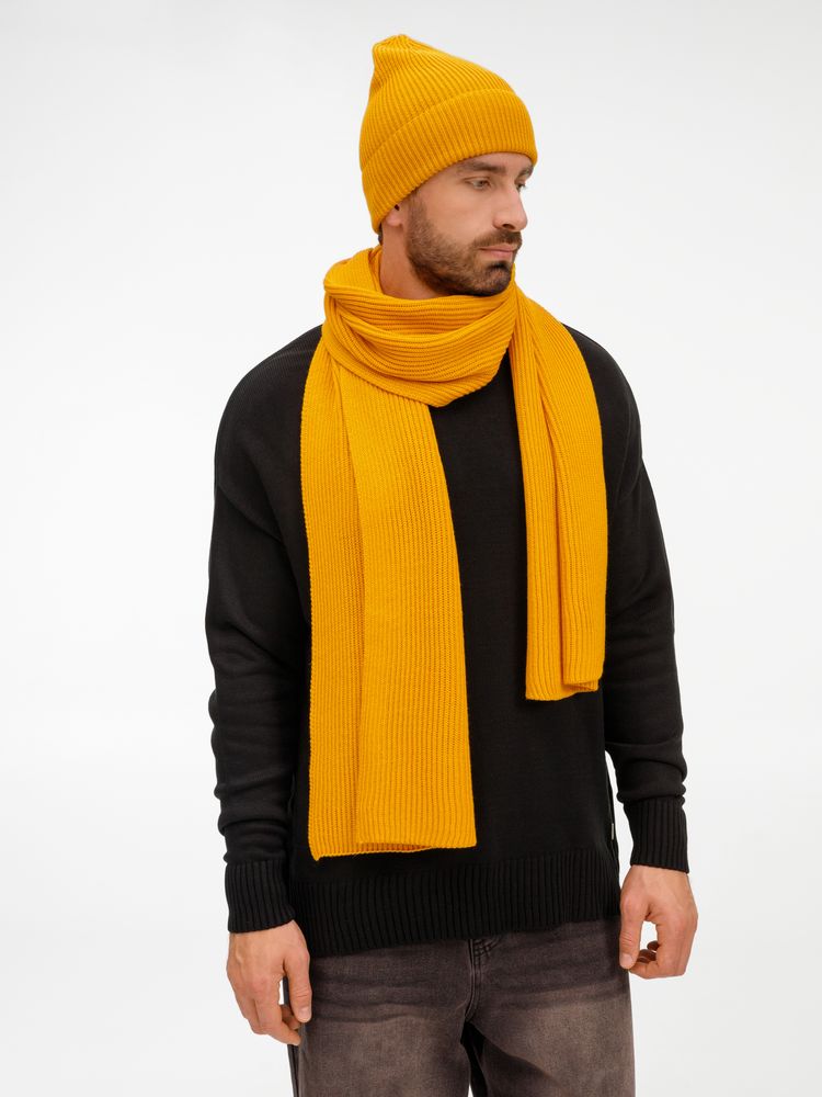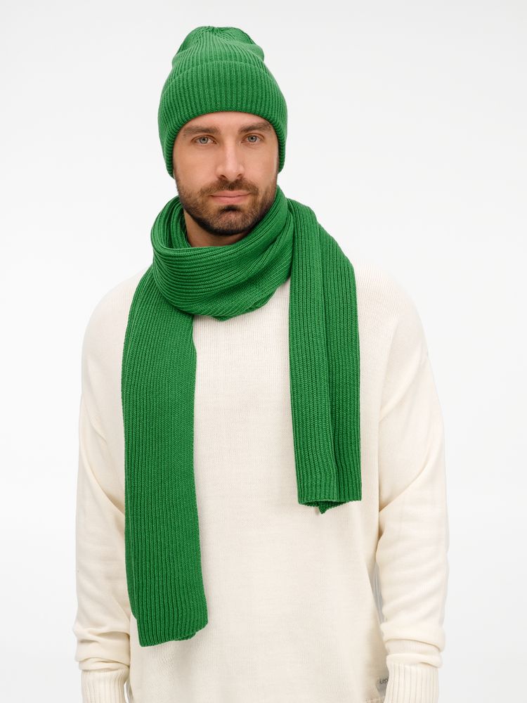 Удлиненная шапка с широким отворотом и фактурной вязкой мягко облегает голову, создавая элегантный силуэт. Широкий шарф с выразительным рельефом позволяет экспериментировать с драпировками, добавляя образу объем и динамику. Перчатки с аккуратной резинкой на манжете обеспечивают идеальную посадку и тактильный комфорт.
