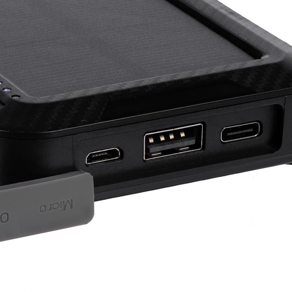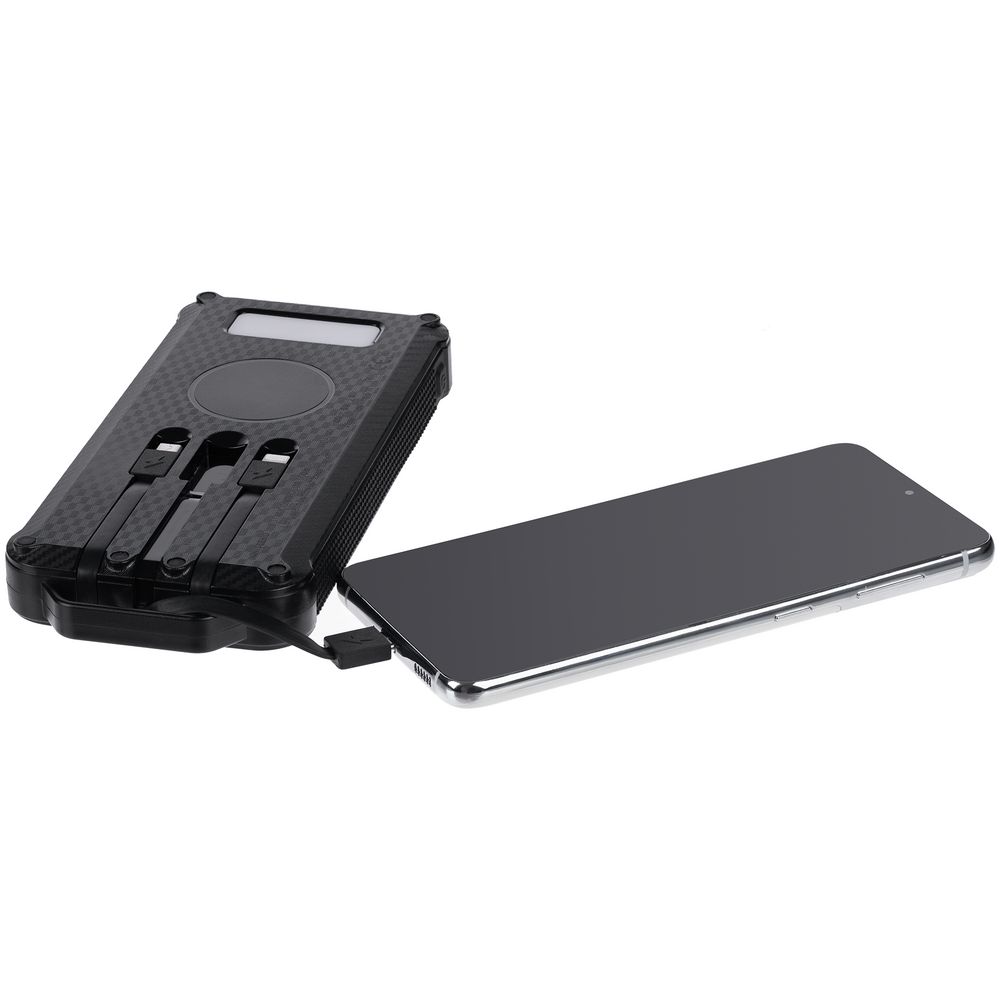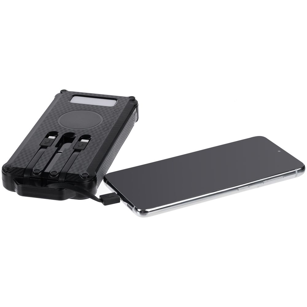 Прорезиненные вставки и рисунок на корпусе с имитацией карбона добавляют агрессивности внешнему виду аккумулятора — сразу видно, что его хозяин готов к приключениям.
