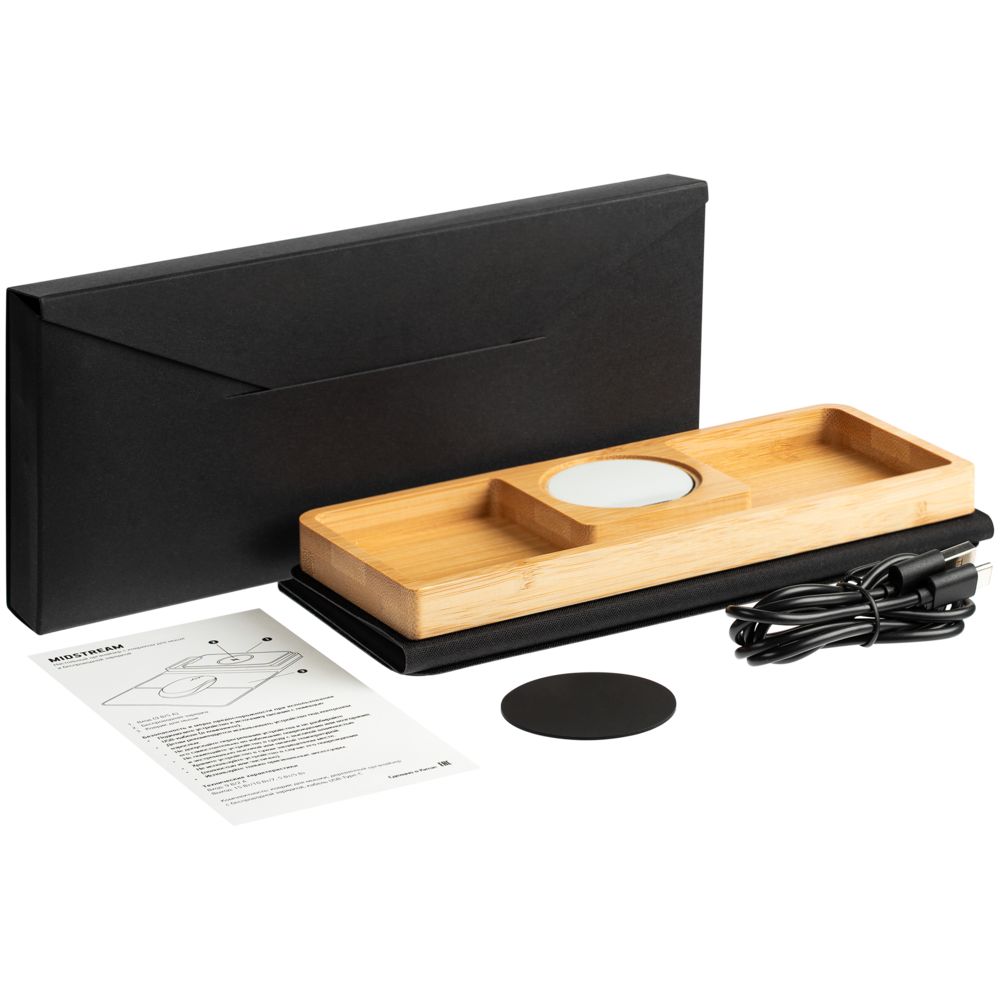 Настольный органайзер Midstream состоит из бамбуковой подставки для беспроводной зарядки телефона с емкостью для хранения мелких предметов и коврика для мыши. Зарядка и коврик с помощью магнитов соединяются друг с другом, образуя единое целое, но при необходимости могут использоваться и по отдельности. Коврик складывается, и можно подобрать удобный размер.