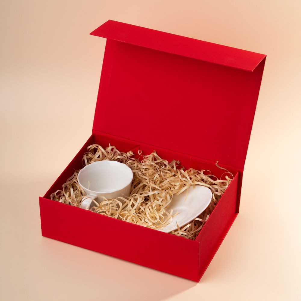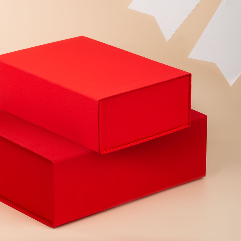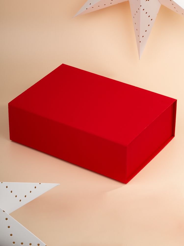 Коробка из переплетного картона, кашированного тисненой тонированной в массе бумагой, с крышкой на магните.