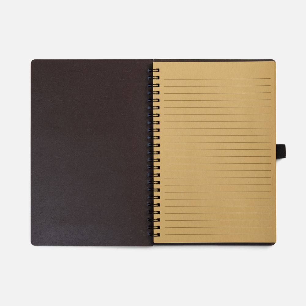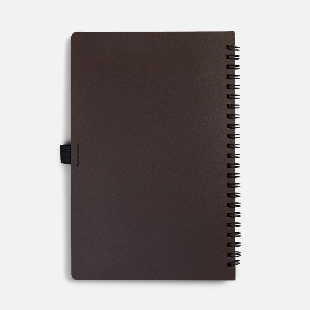 Блокнот на спирали из пластика и кофейного жмыха, дополнен резинкой для ручки.