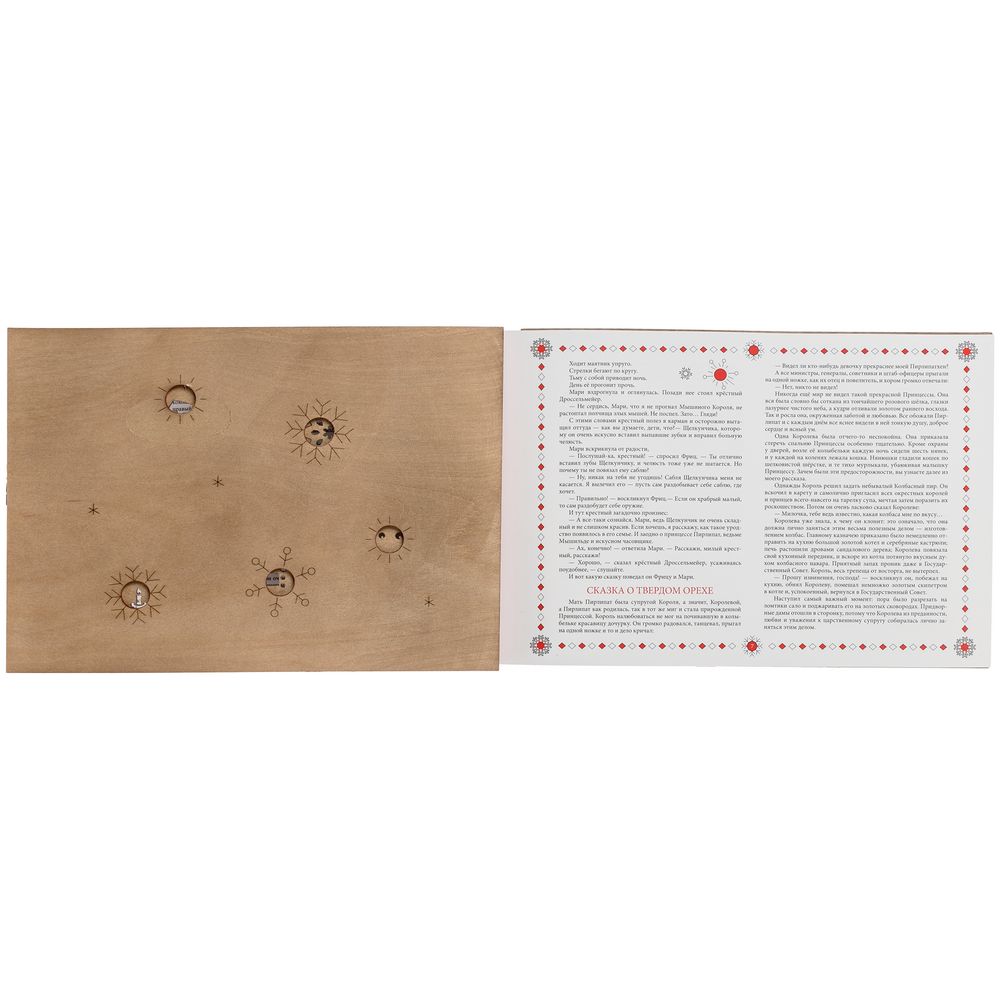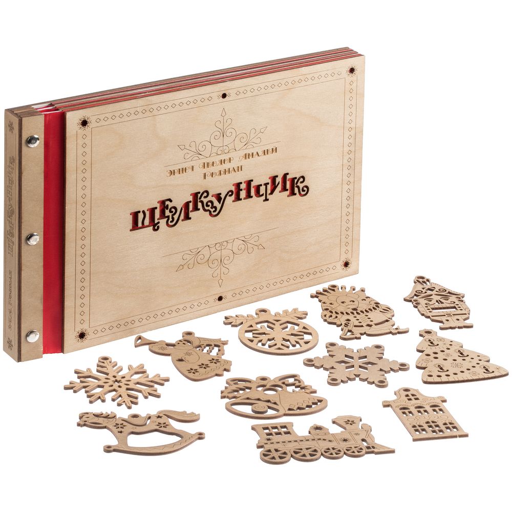 Новогодняя книга «Щелкунчик» способна вызвать тот неповторимый трепет от встречи с чем-то волшебным. Это сразу два чудесных подарка в одном необычном исполнении: резную книгу можно не только читать, любуясь каждой страницей, но и преобразовывать в настоящие деревянные елочные игрушки. Так история оживает прямо на глазах — как в лучших сказках и самой богатой фантазии, а сам презент впечатлит оригинальной задумкой и исполнением.В наборе книга Э.Т.А. Гофмана«Щелкунчик» в сокращении и 11 деревянных подвесок на елку.