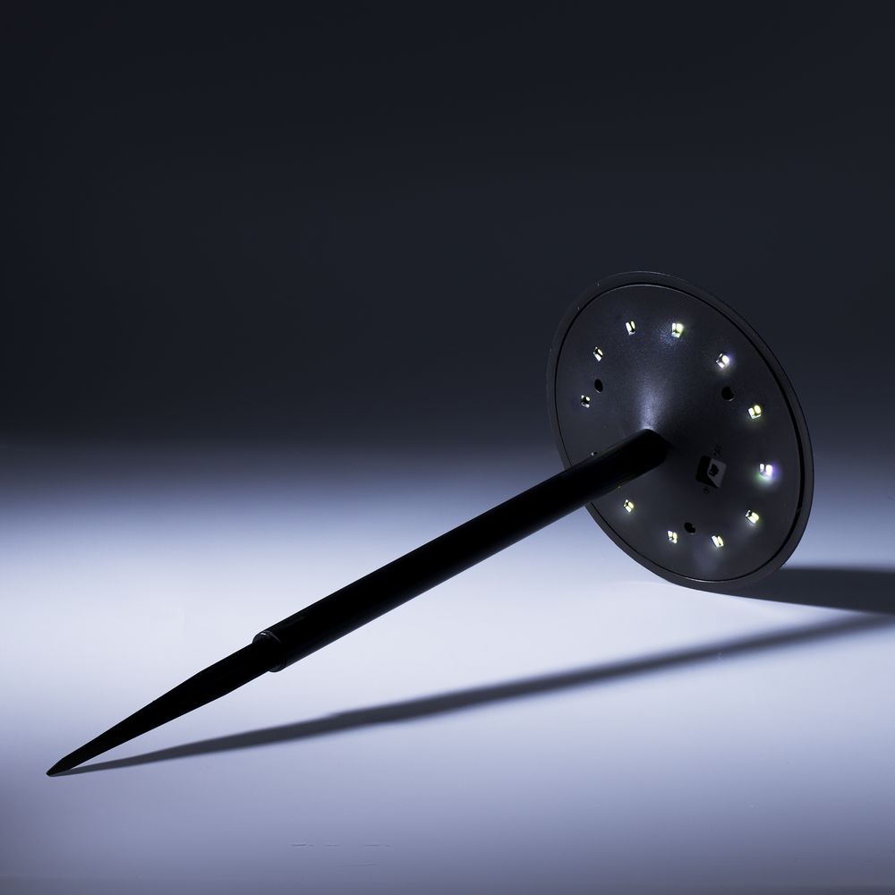 Не требует замены батареек или зарядки аккумулятора, так как заряжается от солнечного света, и сложной установки — фонарик достаточно просто воткнуть в землю в любом удобном месте.