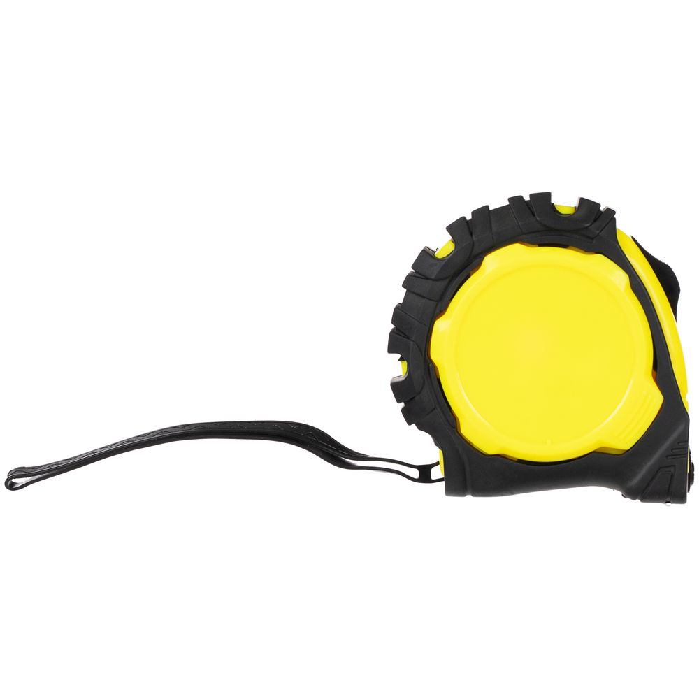 Длина измерительной ленты 5 метров позволяет работать на больших расстояниях. Лента оснащена магнитным наконечником для надежного сцепления с металлическими поверхностями. Корпус рулетки выполнен из прочного пластика с накладкой из ПВХ, которая предотвращает скольжение инструмента в руке.