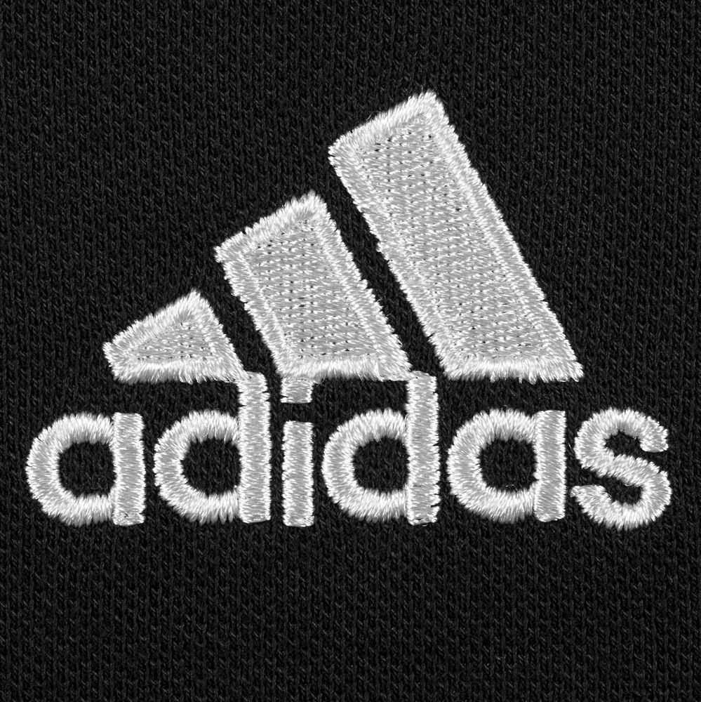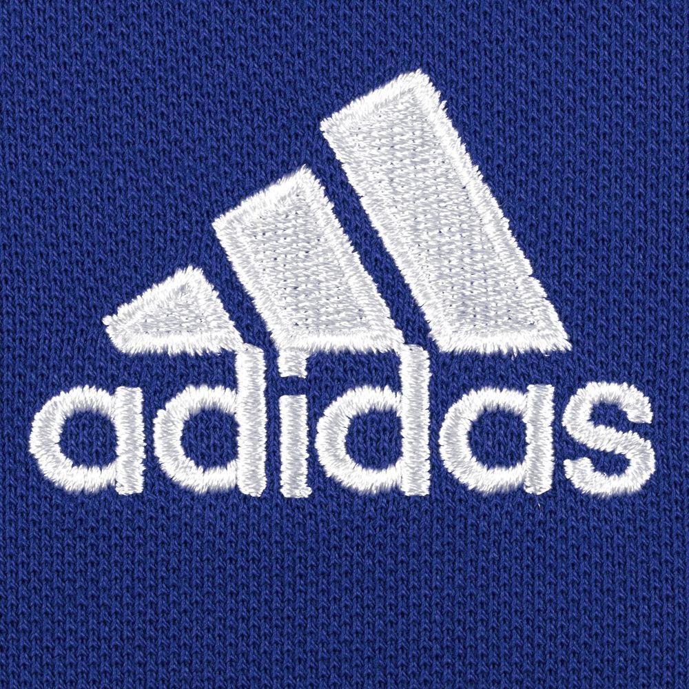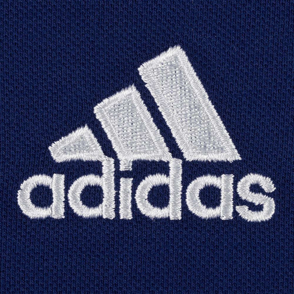 Планка на 2 пуговицы, воротник-резинка 1х1, вышитый логотип adidas справа на груди, три полоски в тон на плечах и рукавах.