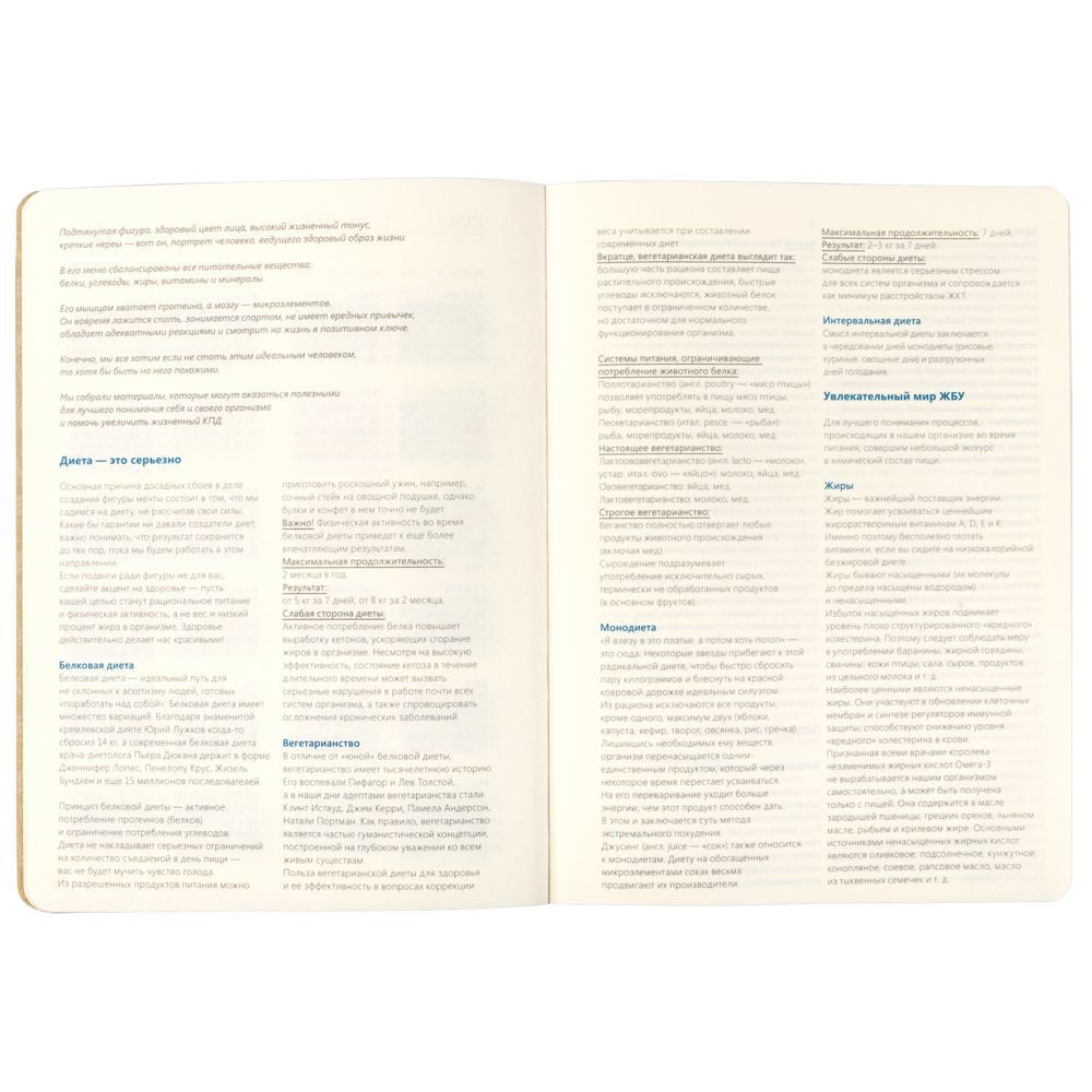 Правильно питаться, много двигаться, мыслить позитивно и избегать стрессов — отличный способ сохранить здоровье и повысить продуктивность. Здоровый образ жизни, или ЗОЖ, прежде всего требует грамотного планирования. Здесь и должен помочь ежедневник, который позволяет учитывать калорийность употребленных продуктов, объем выпитой жидкости и количество калорий, истраченных в ходе тренировки, пробежки или пешей прогулки. Кроме того, на его страницах размещена информация о полноценном диетическом питании, обменных процессах в организме, йогических практиках и отказе от вредных привычек.