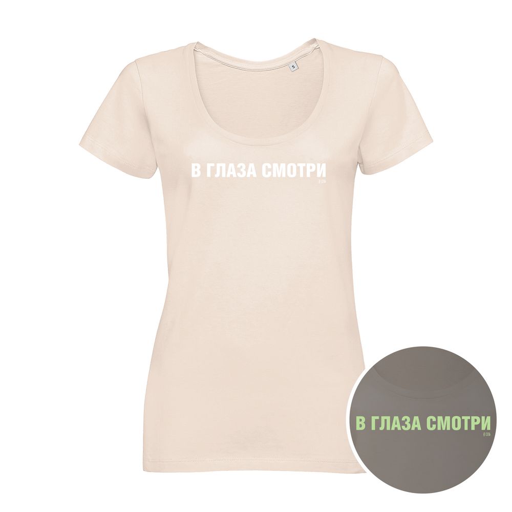 Кажется, люди стали меньше смотреть друг-другу в глаза. Принт на футболке напомнит об этом даже в темноте – благодаря люминесцентной краске. Смотрите открыто, улыбайтесь и дарите хорошее настроение — это отличный повод для общения!Женственная футболка с глубоким круглым вырезом.