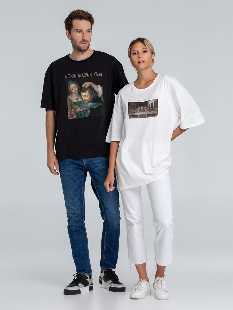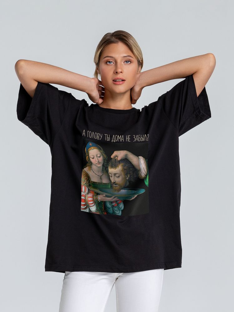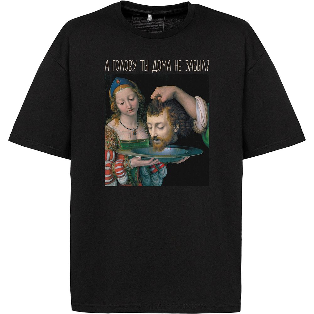 Оверсайз футболка с ярким напоминанием не забыть, выходя на улицу, что-нибудь важное! Сюжет эпохи Ренессанса о прихоти Саломеи иллюстрирует известную присказку: самое главное, что человек может забыть — это его голова. Забытый телефон, кошелек, ключи — мелочь, по сравнению с оставленной дома мыслящей частью тела.