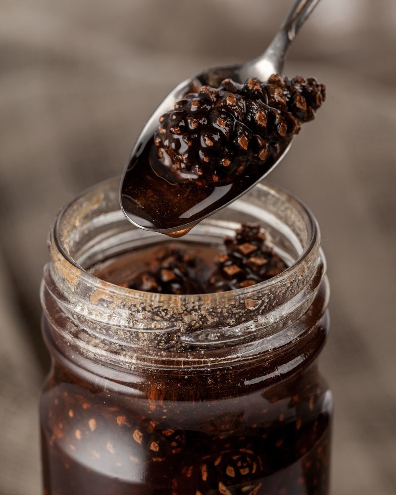 По своей структуре варенье из сосновых шишек напоминает жидкий мед, однако вкус у него совсем другой — в меру сладкий, с тонкой смолянистой ноткой и приятной кислинкой. Съедобно в нем не только желе, но и сами шишки — мягкие и сохранившие свой приятный хвойный аромат.Объем 200 мл.