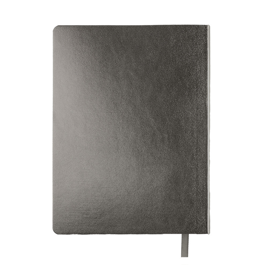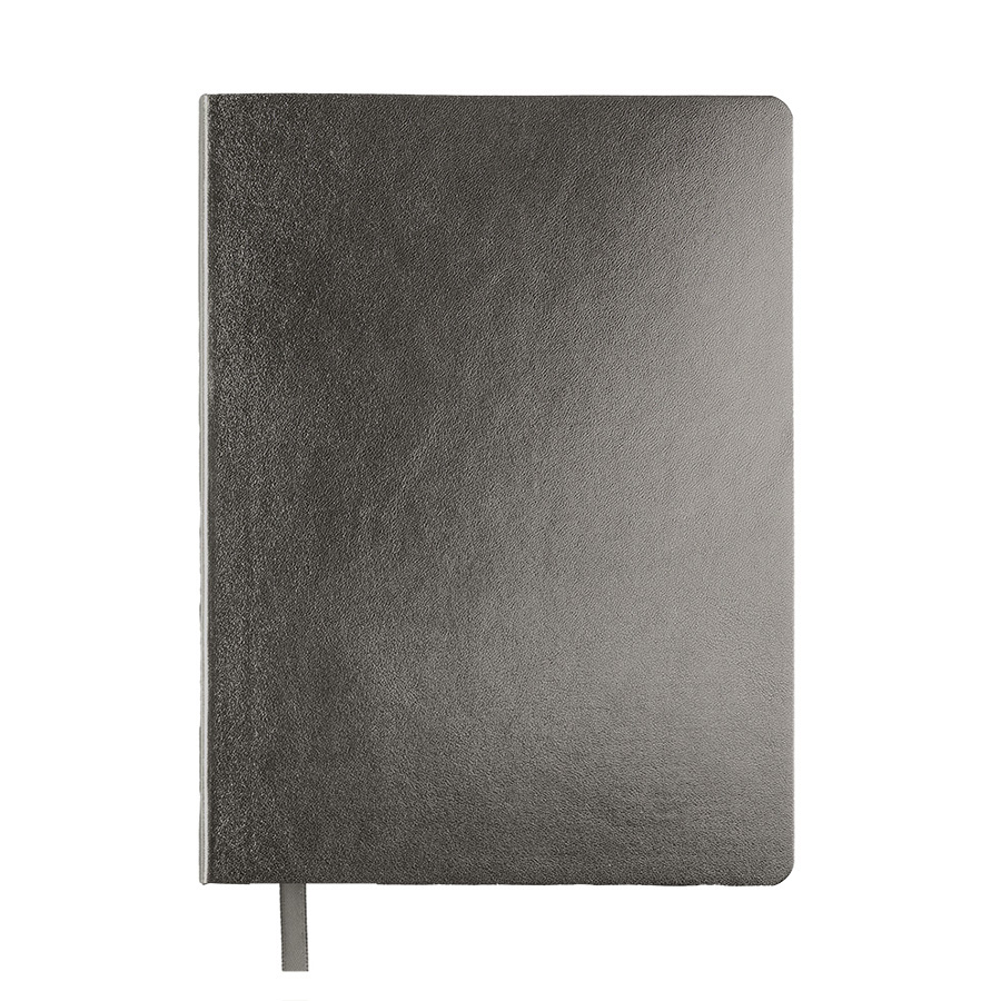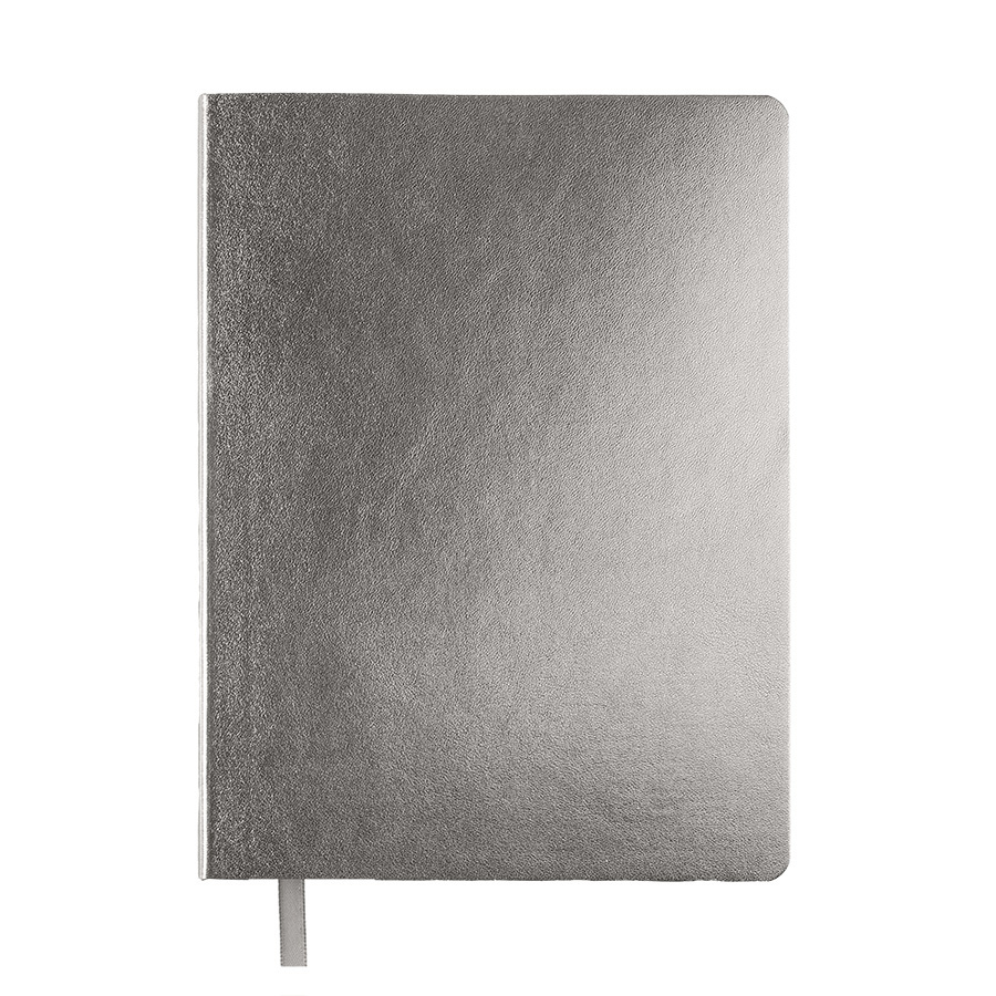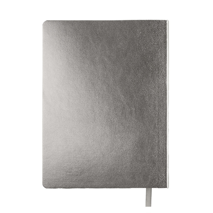 Бизнес-блокнот AURI в серебристом исполнении — сочетание современного делового стиля и премиального дизайна. Мягкий переплёт из нетермоактивного PU‑материала приятен на ощупь и визуально напоминает слиток благородного металла. Серебристый обрез страниц подчеркивает минималистичный образ, превращая рабочий инструмент в статусный аксессуар.Основные характеристики:Формат: 145×205 ммПереплёт: мягкий, из нетермоактивного PU‑материалаОбрез: серебристый, матовыйБлок: 256 страниц, кремовая эвкалиптовая бумага, плотность 70 г м²Разлиновка: клеткаУглы: скруглённыеЛяссе: ширина 7 ммДополнительно: перфорация на последних страницахУпаковка: черный сливбокс из переработанного картона+ бумагаВнутренний блок обеспечивает комфортное письмо и приятный визуальный контраст с серебристой обложкой. Упаковка защищает изделие при транспортировке и подчёркивает ответственное отношение к экологии.
