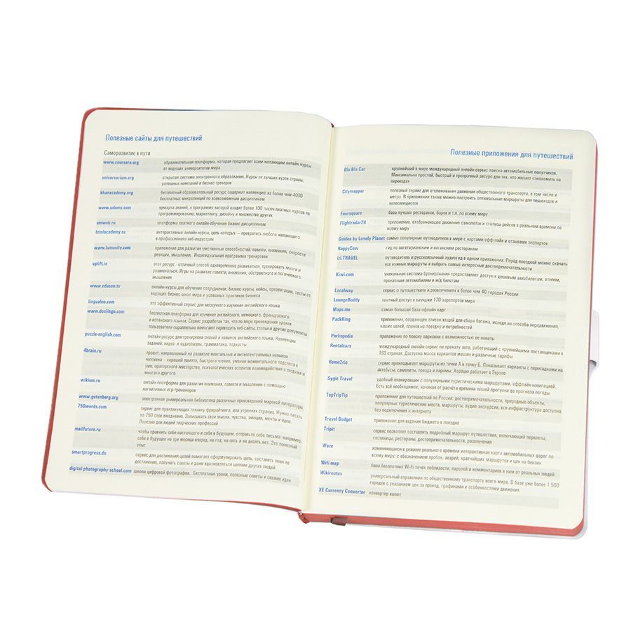 Цвет обложки черный Цвет обреза, близкий к пантону 2035U Размер 145*205 мм, переплет мягкий Обложка PU Valse PU застежка-клапан на кнопке Блок недатированный, в линейку Скругленные углы, двухкрасочная печать Бумага кремовая, плотность 70г м2 Форзац нахзац в цвет обреза 272 страницы 8 инфостраниц для путешествий Ляссе в цвет обложки Упаковка крафтовый сливбокс